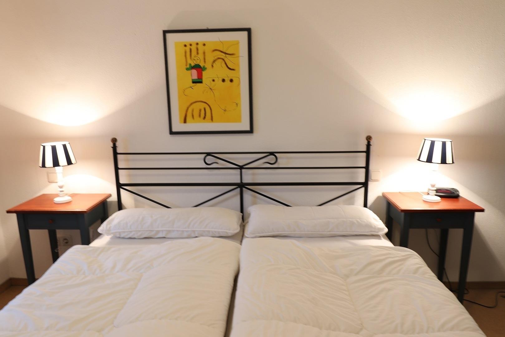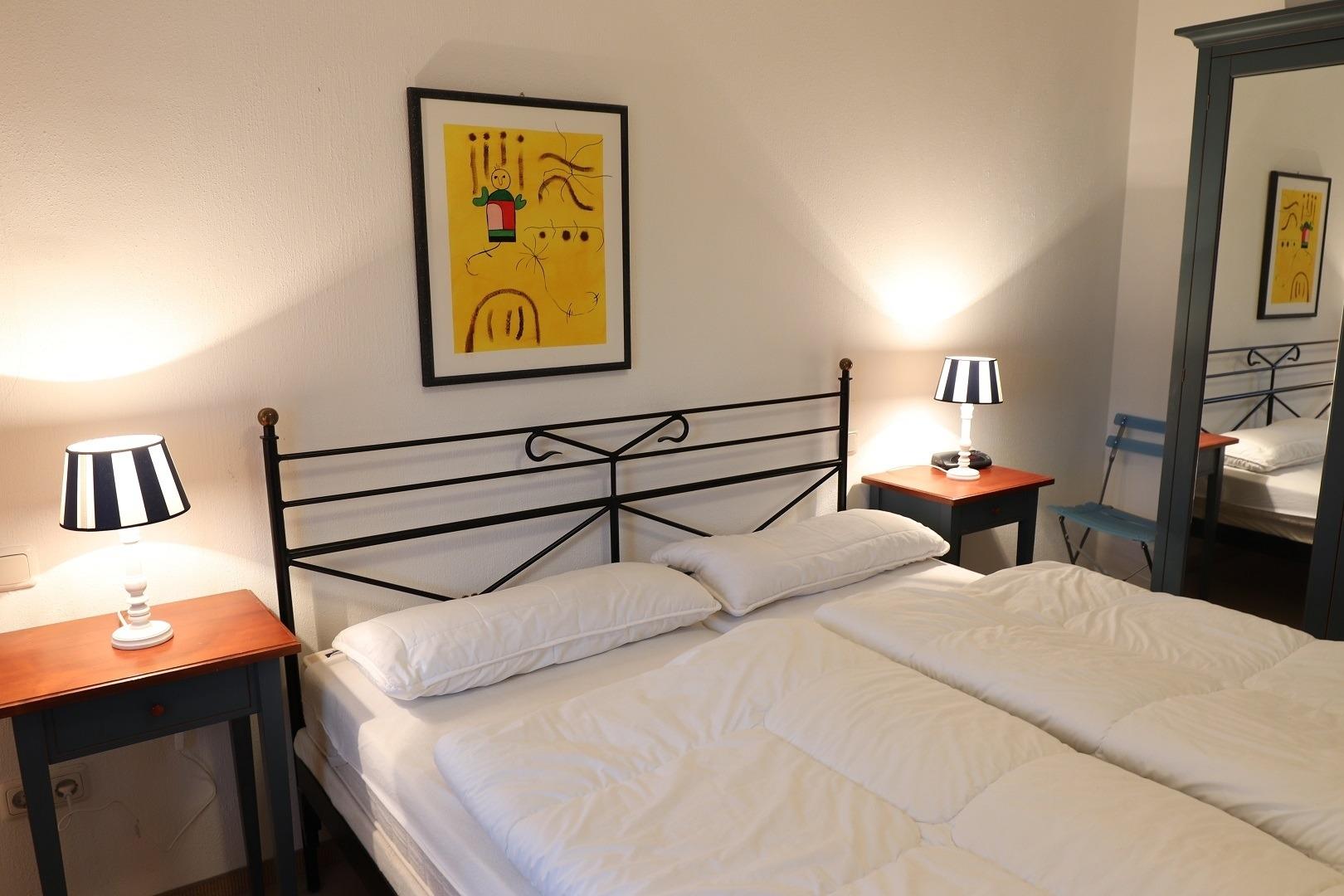 Das Schlafzimmer beinhaltet einen Kleiderschrank sowie ein Doppelbett.