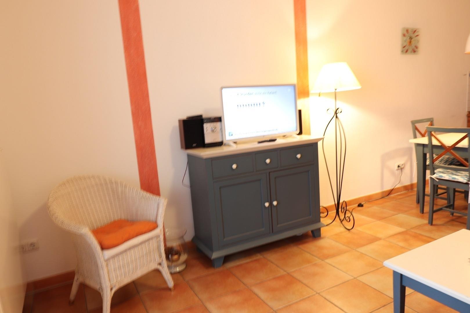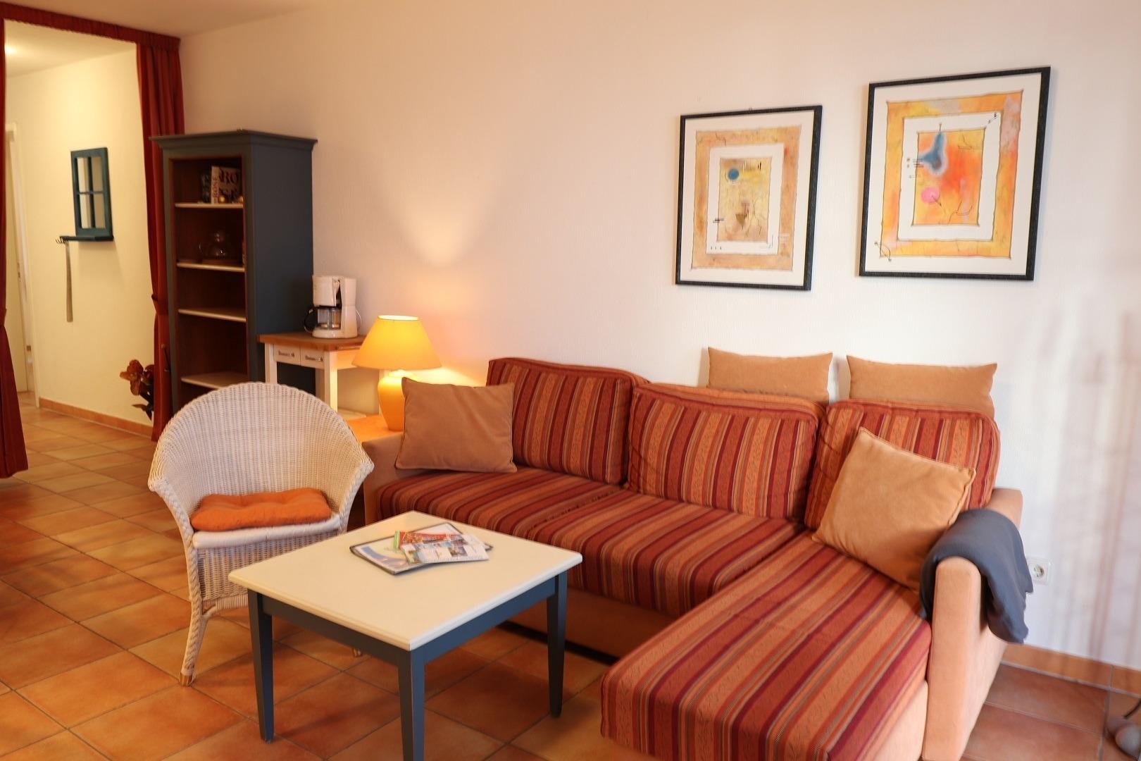 Im Wohnbereich befindet sich eine gemütliche Sitzgruppe mit Schlafsofa (im Notfall), sowie TV und CD-Anlage.