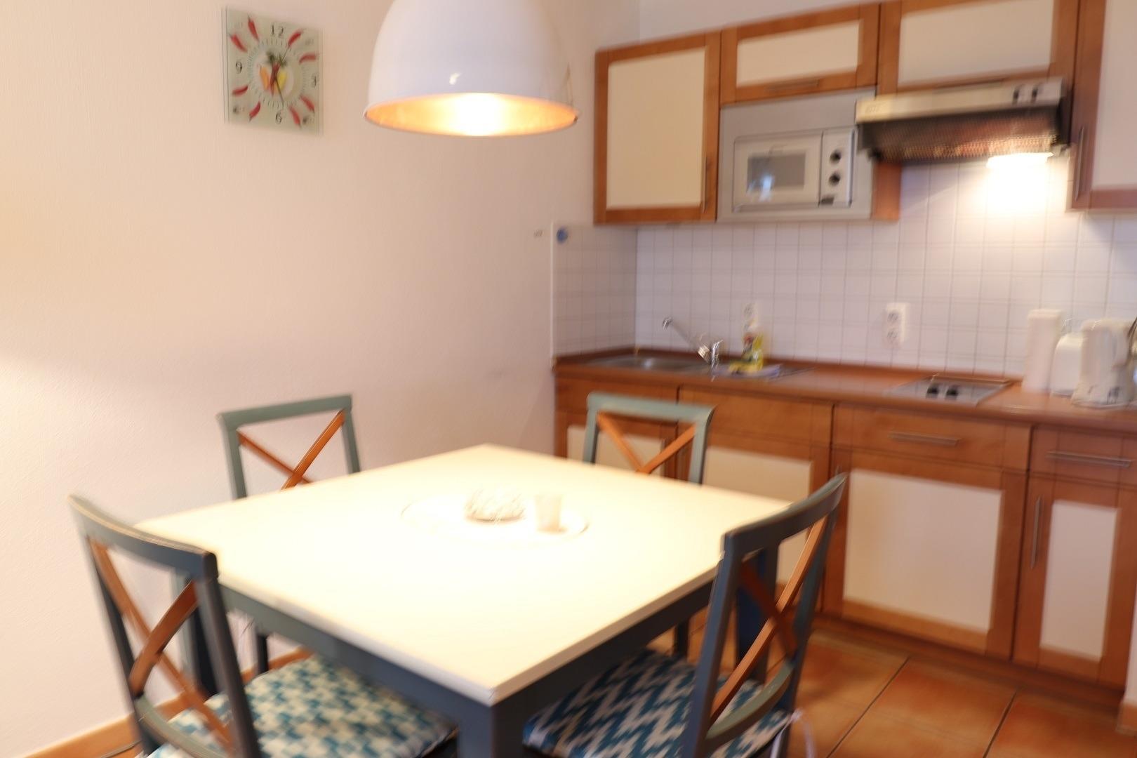 Die moderne Küche ist im Wohnbereich integriert. Ausgestattet ist Sie mit Mikrowelle, 2-Platten-Herd und einem Mini-Grill.