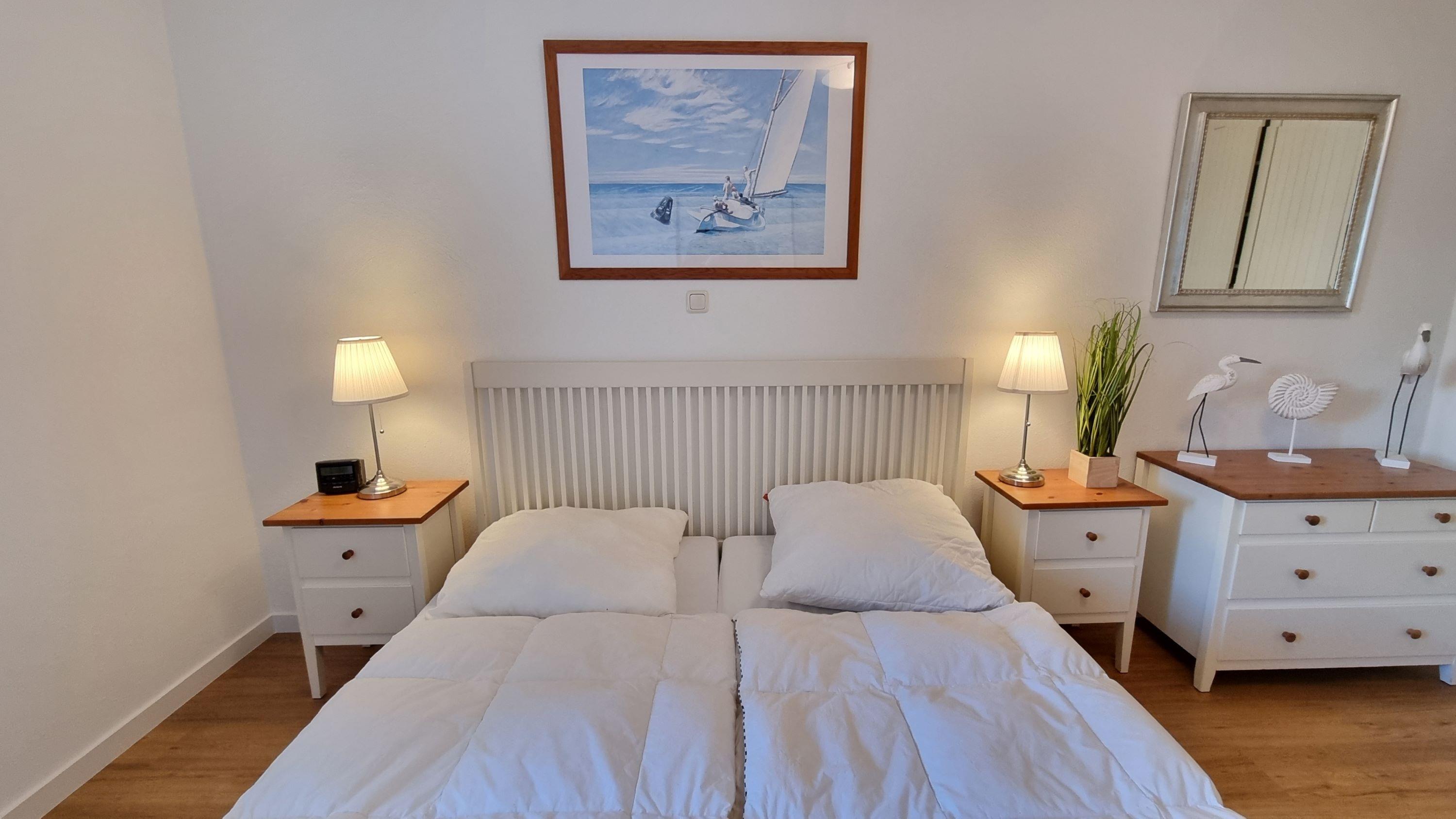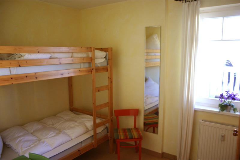 Ein Schlafzimmer mit Doppelbett und ein weiteres Schlafzimmer mit Etagenbett bieten die Schlafmöglichkeiten.