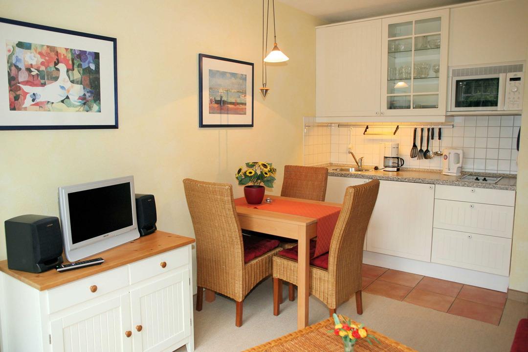 Im Wohnbereich ist eine Pantryküche mit Mikrowelle integriert. Ein Bad/WC mit Dusche ergänzt die Ferienwohnung.