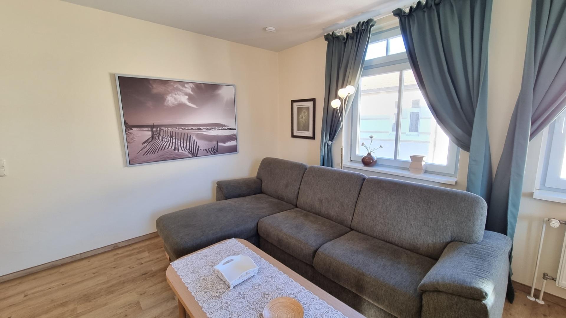 Der Wohnbereich ist eingerichtet mit einer Doppelschlafcouch, Mobilar und einer Essecke.