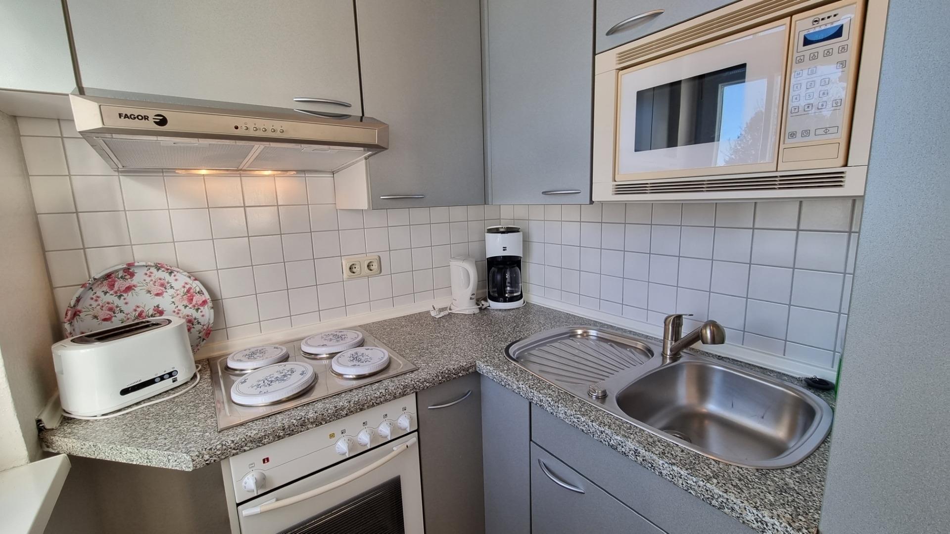 Die Pantryküche mit Mikrowelle und Backofen ist im Wohnbereich integriert.