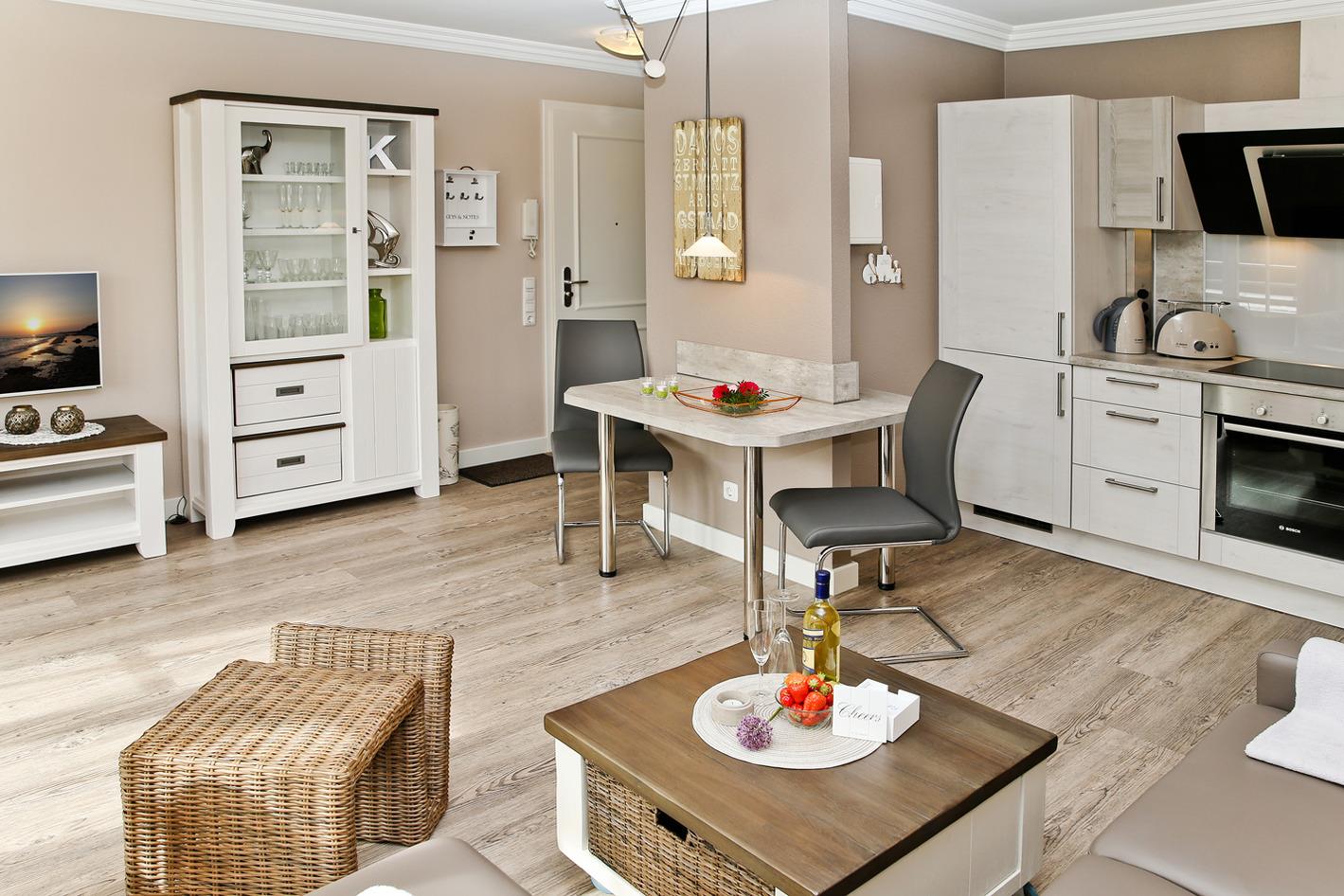 Die gemütliche Fewo bietet genügend Platz für 2 Personen für einen angenehmen Aufenthalt. Die Küchenzeile ist mit Geschirrspüler, Kühlschrank mit sep. Gefrierschrank, Backofen und 4- Platten-Induktionsherd sowie Esstisch im Wohnbereich integriert.