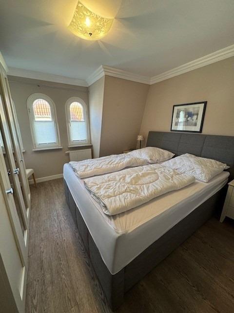 Im Schlafzimmer befindet sich ein Boxspringbett mit durchgehender Matratze und ein großer Kleiderschrank.