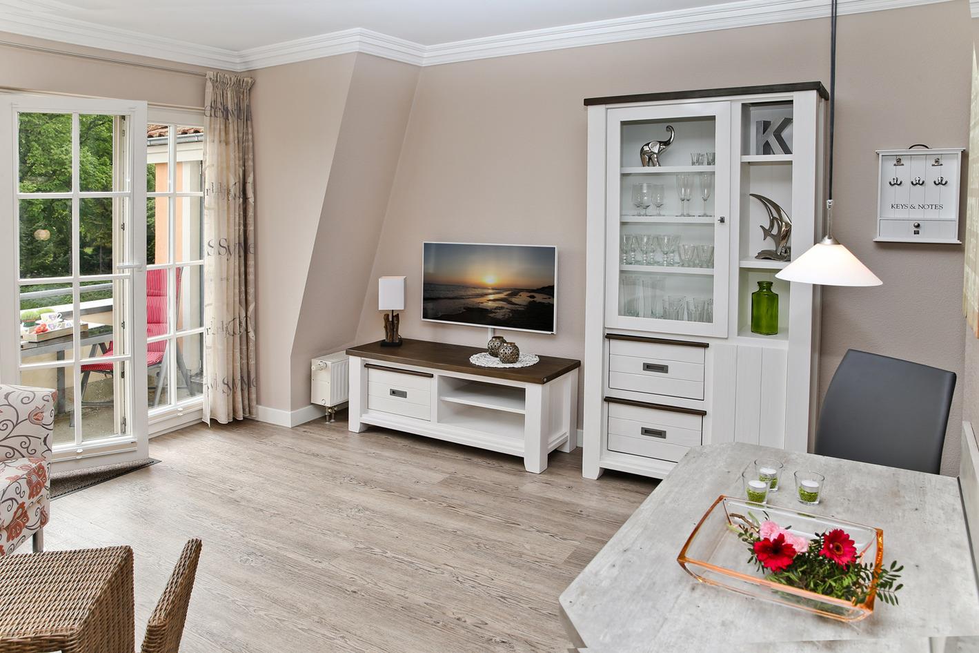 Eine Sitzgruppe mit Sofa und LCD-TV mit Radio befindet sich mit im Wohnbereich.