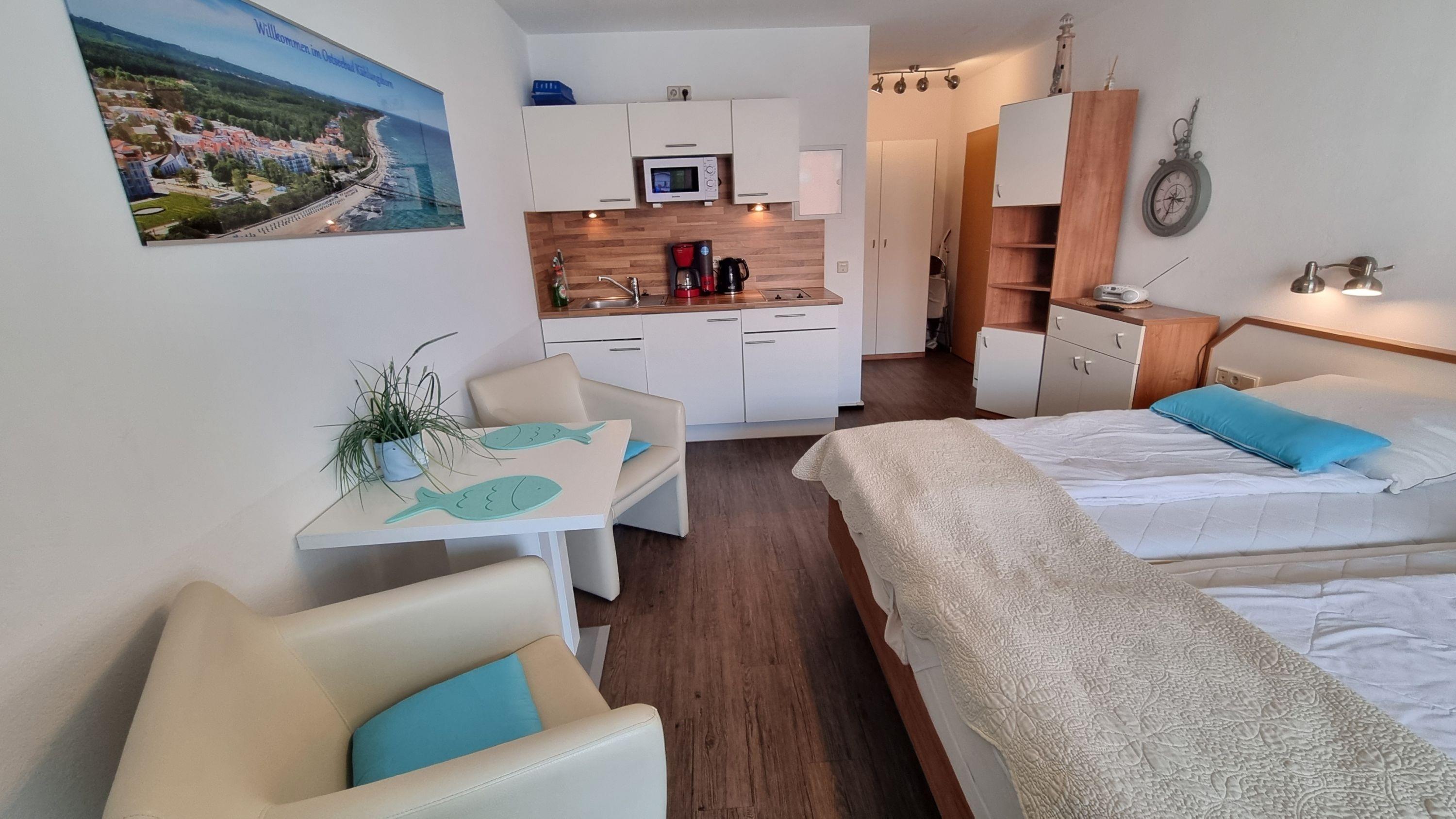 Die Wohnung verfügt über eine voll ausgestattete Küchenzeile mit Geschirrspüler, einem Nord-Balkon und W-LAN.