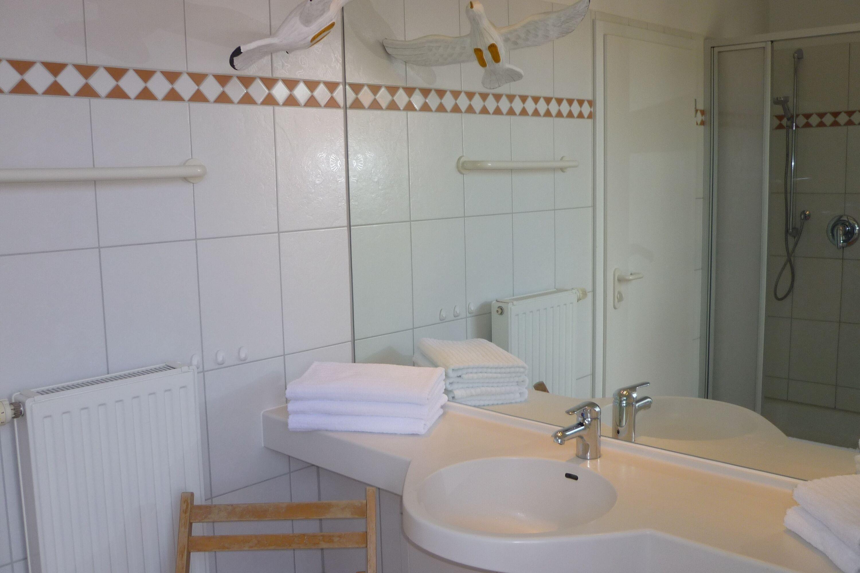Das Badezimmer ist mit einer großzügigen Dusche ausgestattet und verfügt über eine Fußbodenheizung sowie einen Wandspiegel. Besonders angenehm ist der direkte Zugang zu einer der beiden Balkone.
