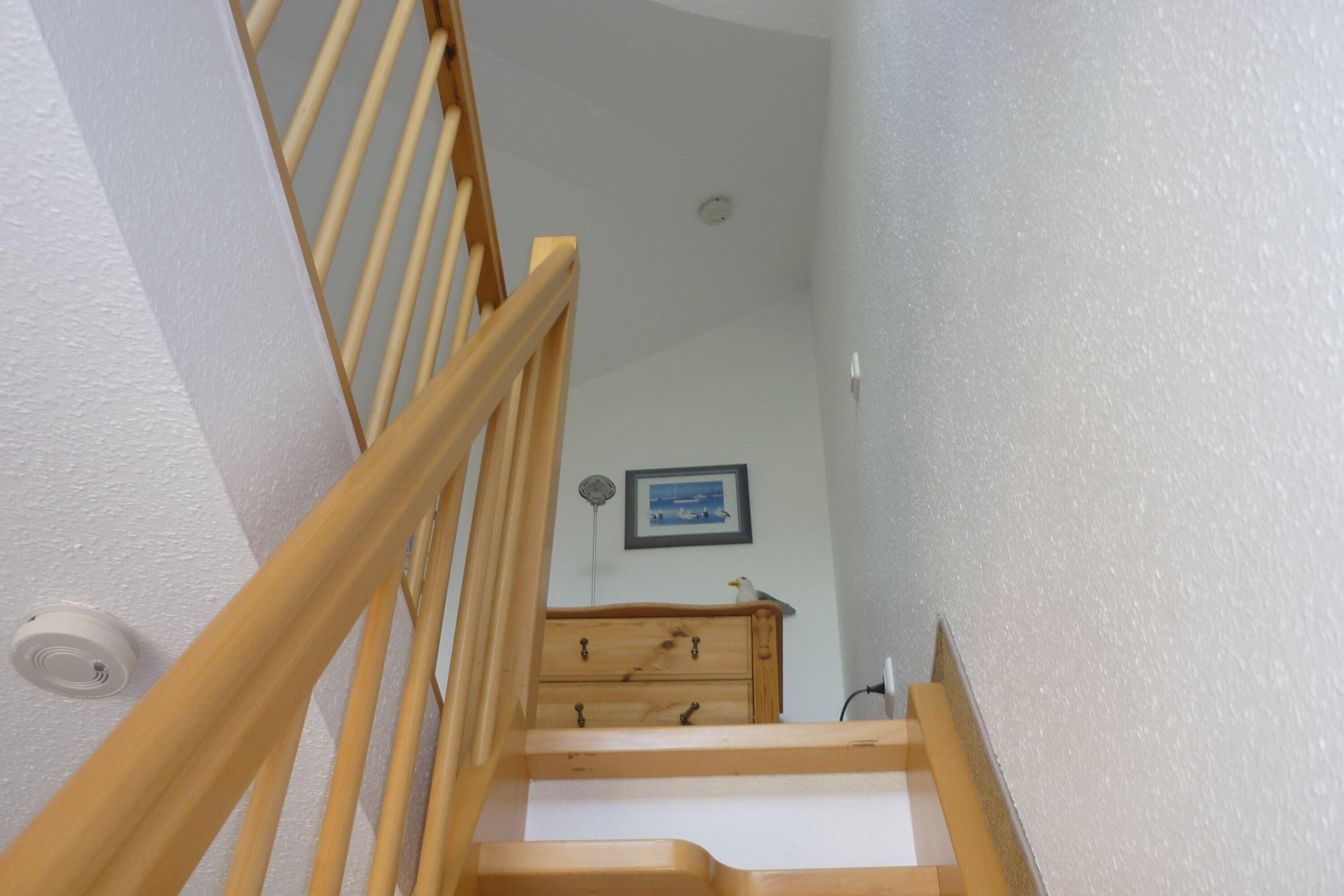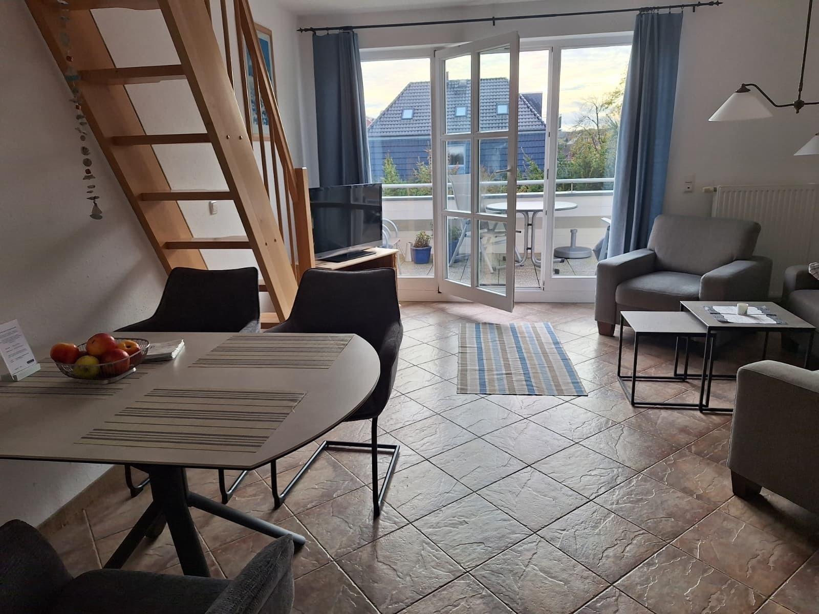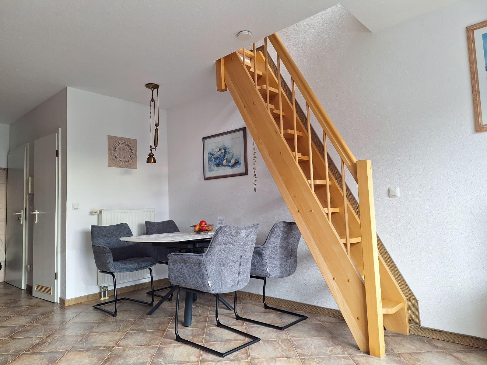 Die Ferienwohnung "Helena" bietet eine geschmackvolle Einrichtung und zwei Balkone, die ideal für erholsame Stunden im Freien sind. Der Wohnbereich ist lichtdurchflutet und verfügt über eine integrierte Küchenzeile, eine Essecke und einen gemütlichen Sitzbereich. Eine Wechselstufentreppe führt zur Schlafempore, die für Kleinkinder aufgrund ihrer schmalen Bauweise nur bedingt geeignet ist. Diese Art der Treppe benötigt ein wenig Übung.