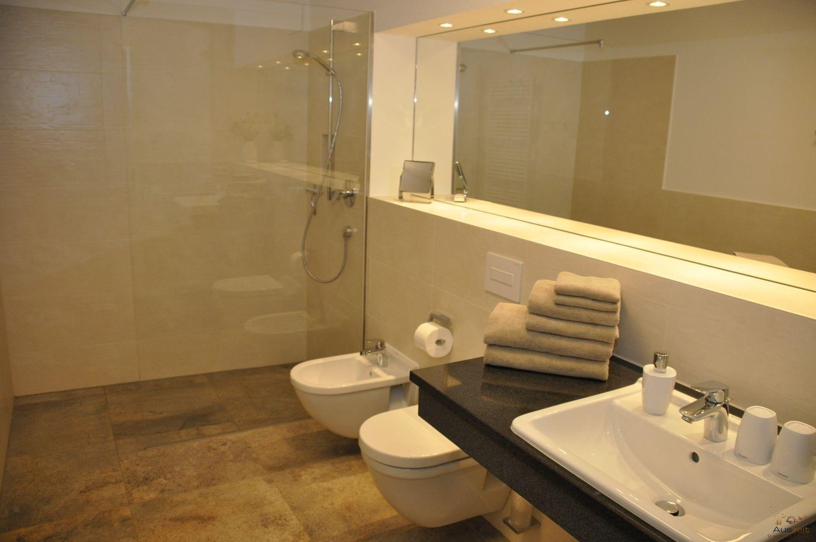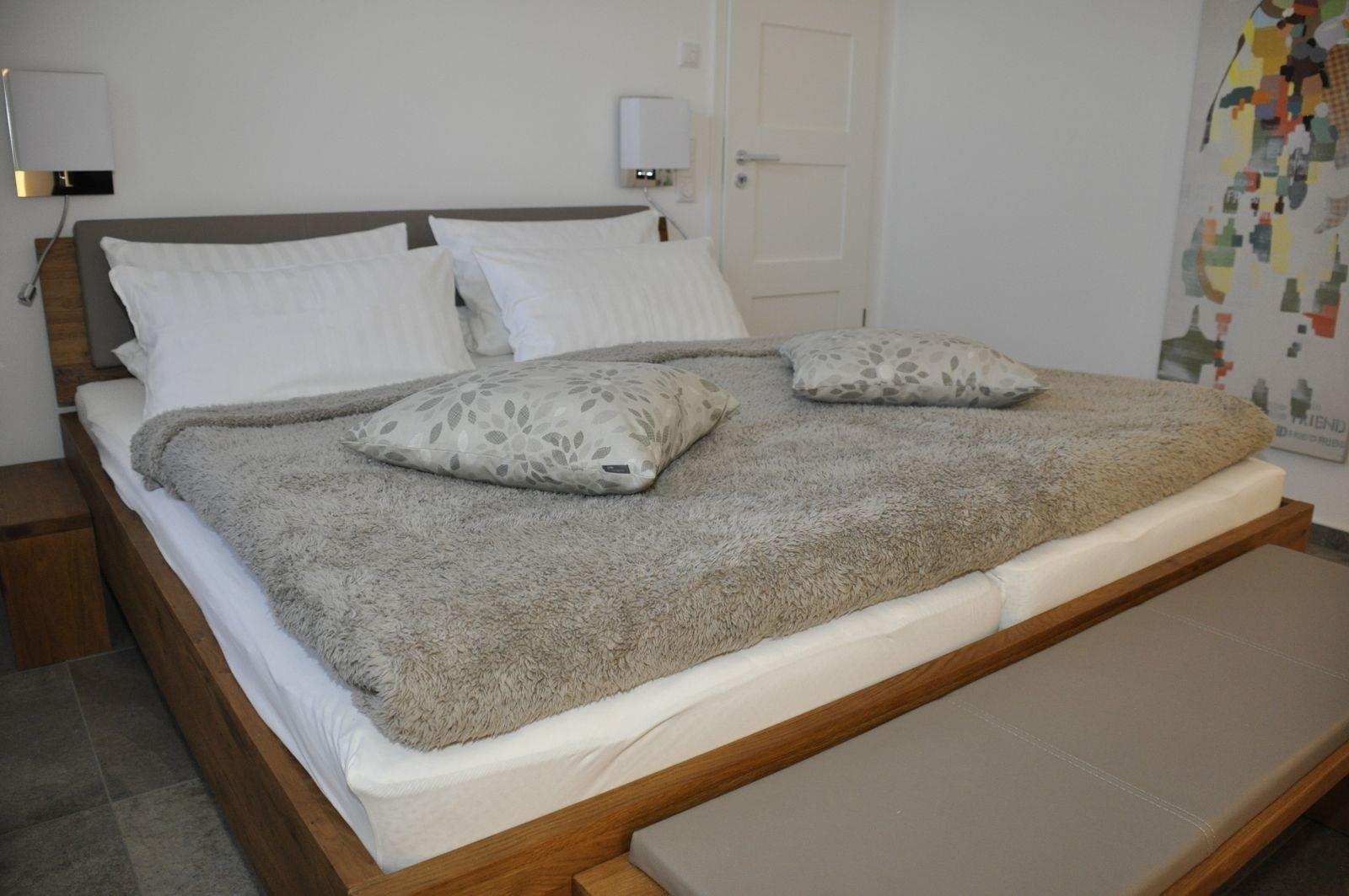 einem Boxspringbett (2.00 x 1.80 m), begehbaren Kleiderschrank und Flachbild-TV. Das Bad mit Dusche verfügt u.a. über ein Bidet, Handtuch-