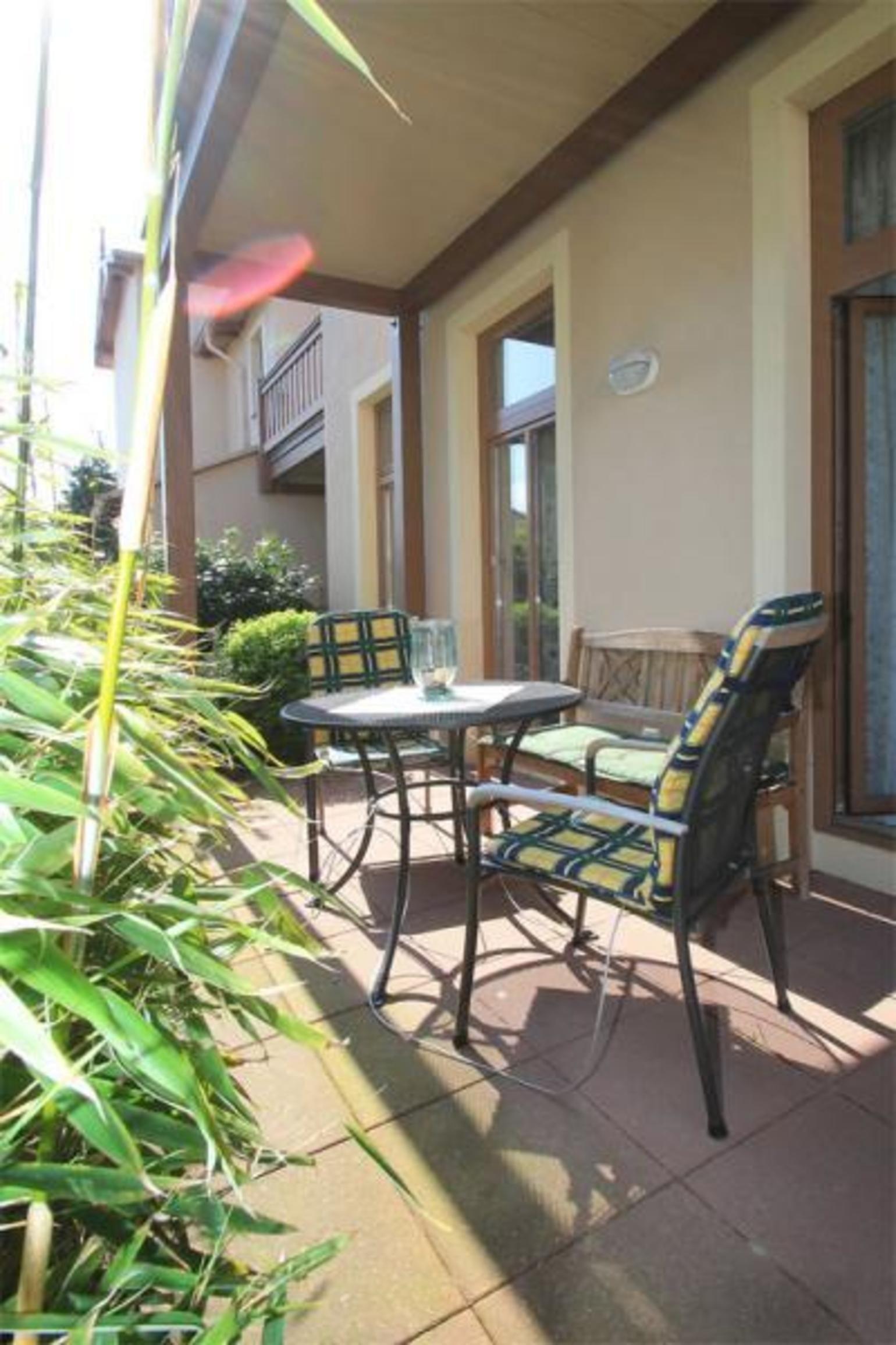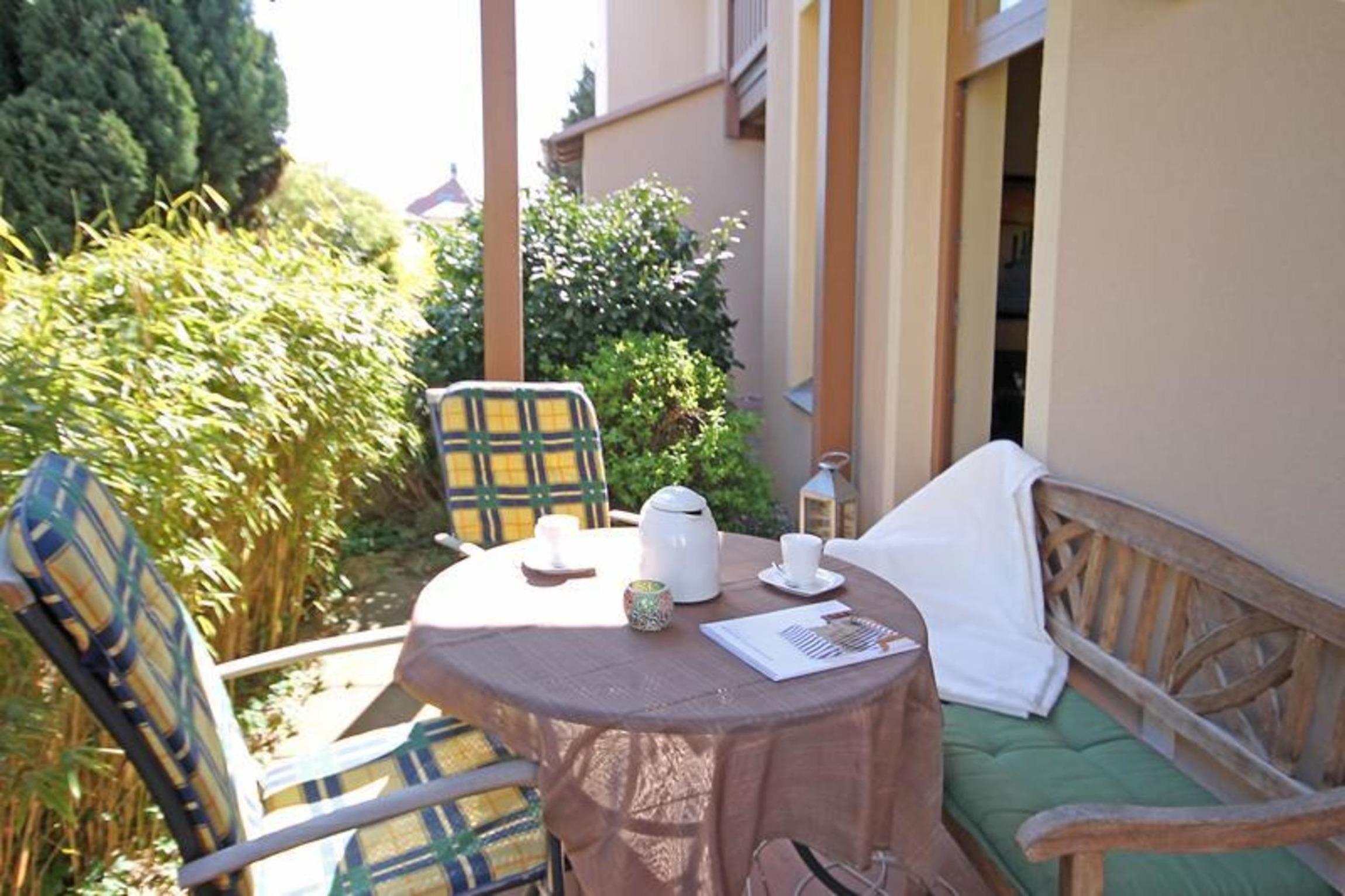 Ihre Auszeit beginnt auf der ruhig gelegenen Süd-/Ost-Terrasse, auf der Sie Ihr Frühstück in der Morgensonne genießen können. Die Terrasse ist mit einer Holzbank und Gartenstühlen ausgestattet. Freuen Sie sich auf ein paar unbeschwerte Stunden mit der Familie im Außenbereich der Wohnung.