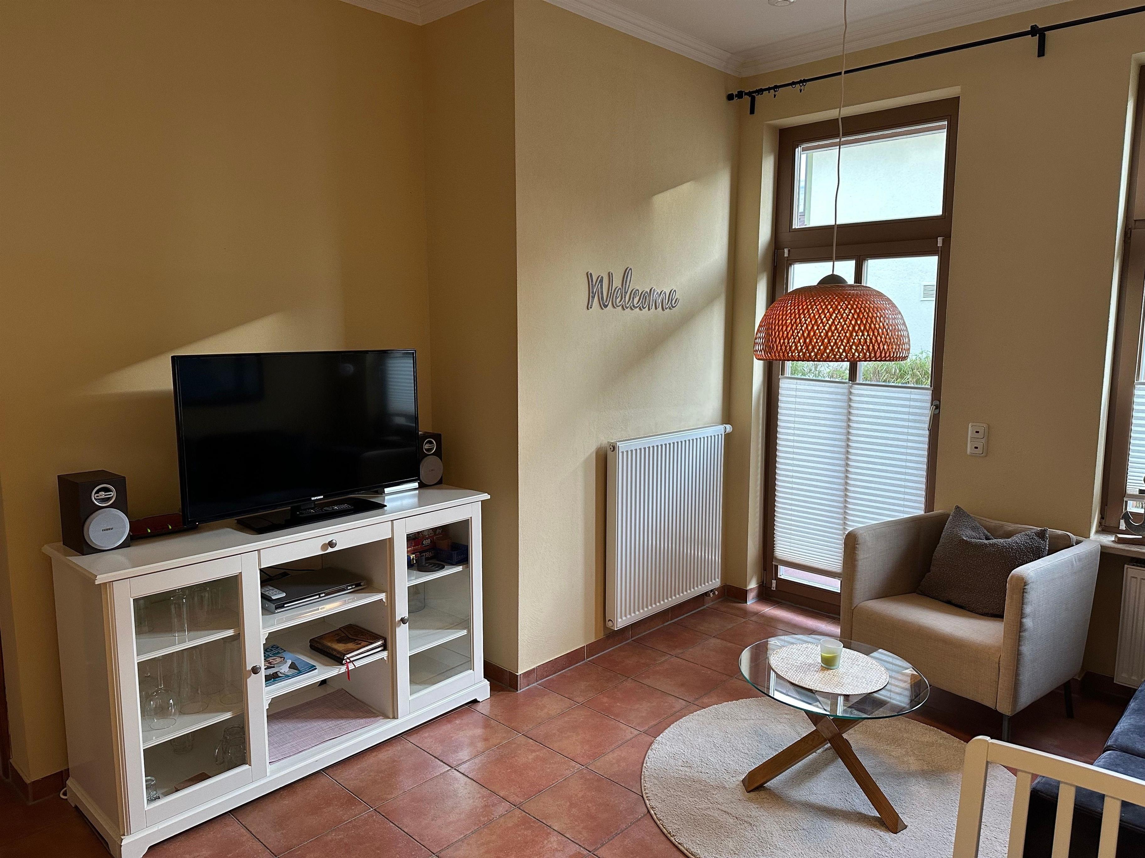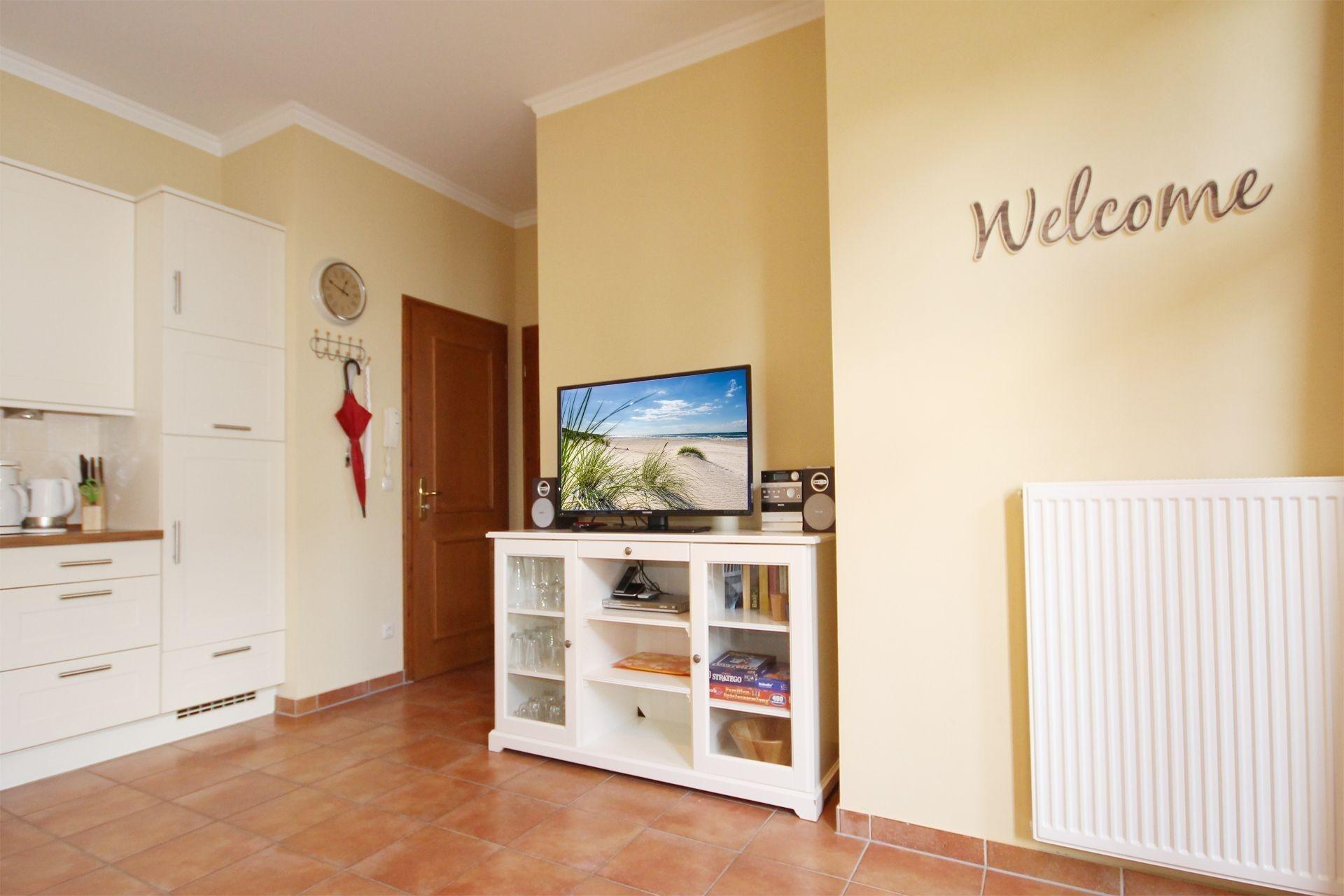 Der Wohnbereich ist mit einem gemütlichen Sofa ausgestattet, auf dem Sie nach einem erlebnisreichen Tag entspannen können. Für ihre Unterhaltung stehen Ihnen ein Flatscreen-TV und eine HiFi-Anlage zur Verfügung. Die Wohnung ist komplett mit hellen mediterranen Fliesen ausgestattet, sodass ein behagliches Wohnambiente geschaffen wird. Die hohen Fensterfronten lassen viel Licht in die Wohnung.