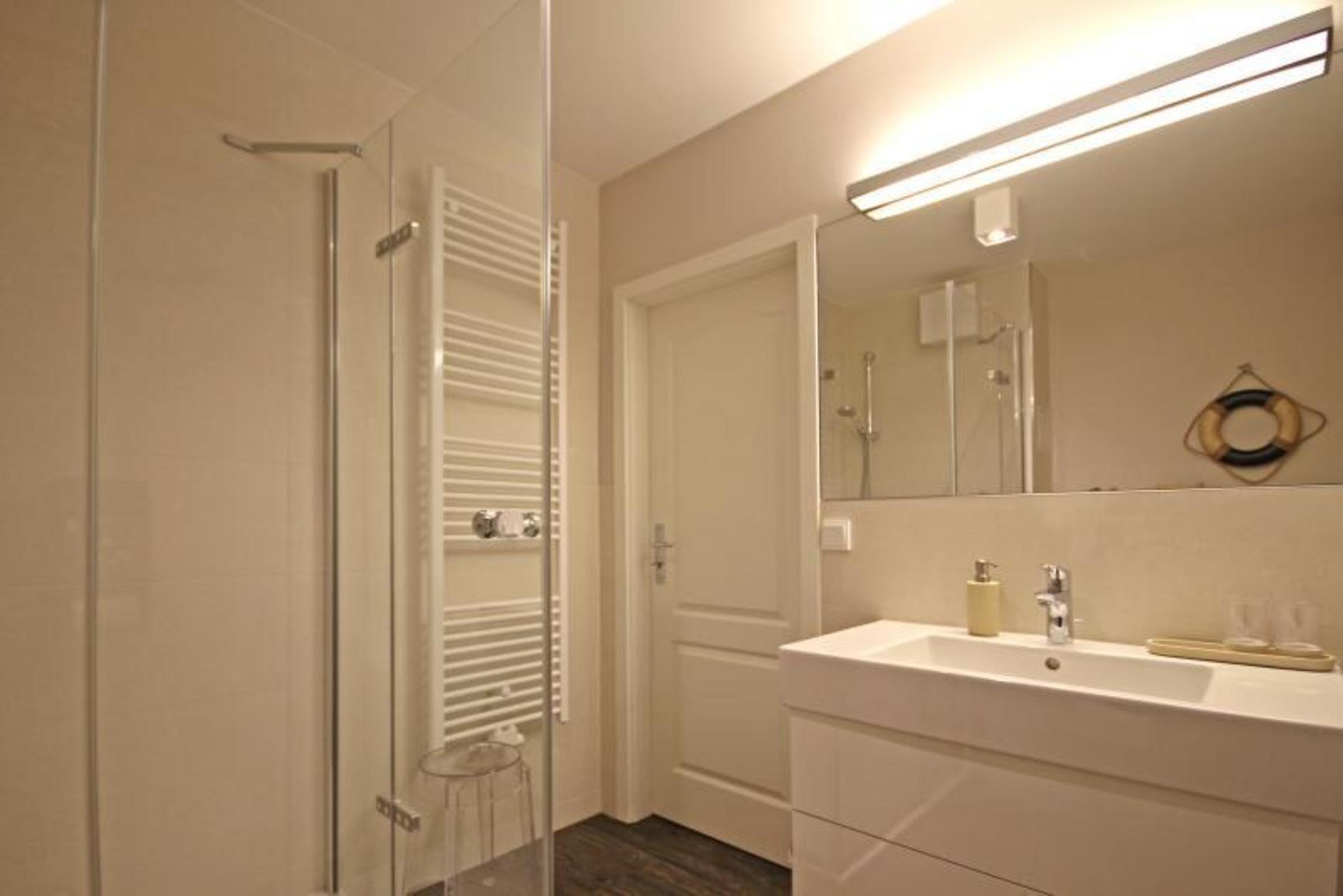 Das exklusive Badezimmer verfügt über eine Dusche mit Sondermaß, ein WC, einen Handtuchheizkörper sowie einen modernen Waschtisch mit großem Spiegel und einem Haarföhn.