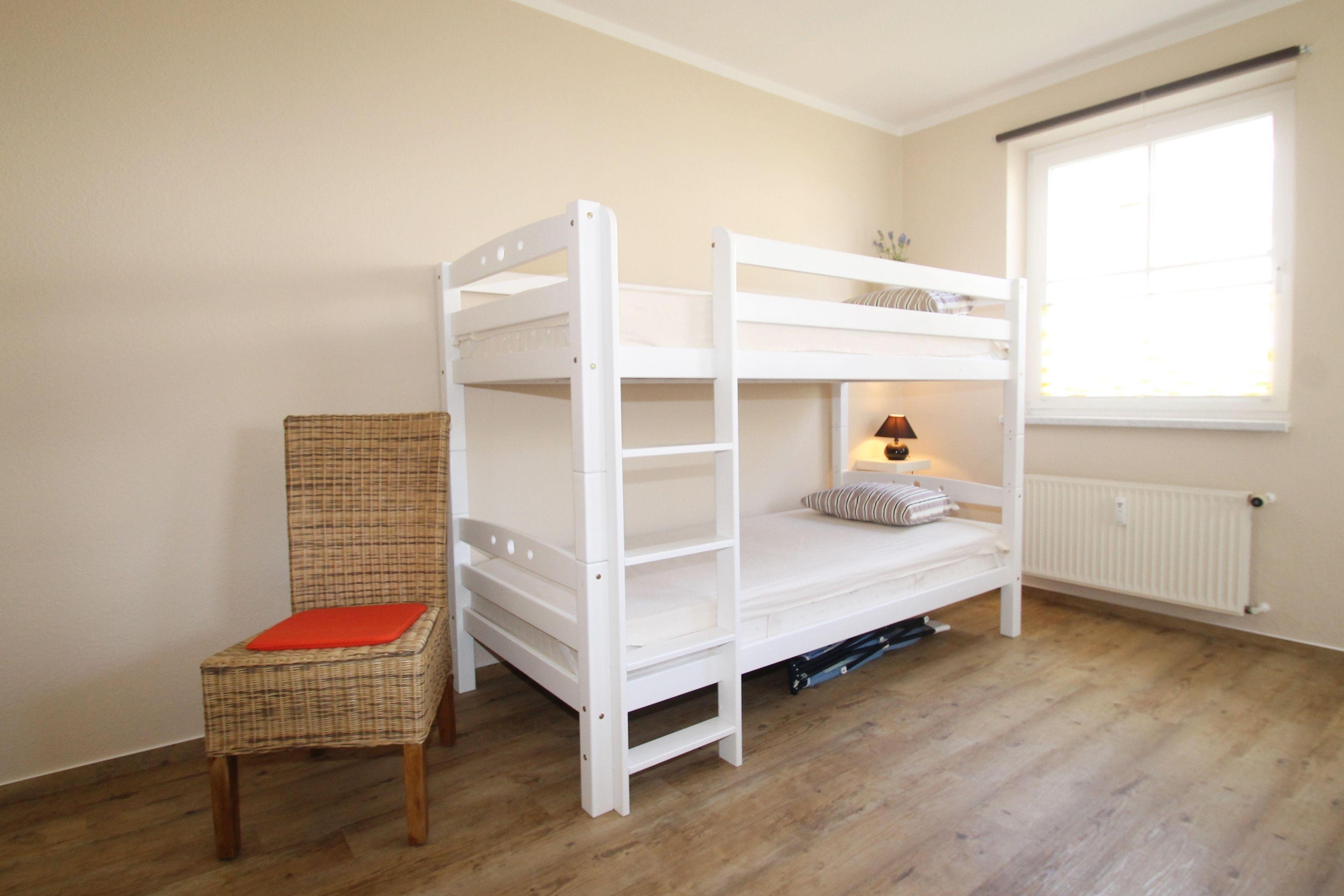 Das erste Schlafzimmer ist mit einem Doppelbett und einem zusätzlichen Doppelstockbett ausgestattet. Auch ein geräumiger Kleiderschrank für Ihre Urlaubsgarderobe steht für Sie bereit. Das Aufstellen eines der Kinderbetten stellt kein Problem dar.