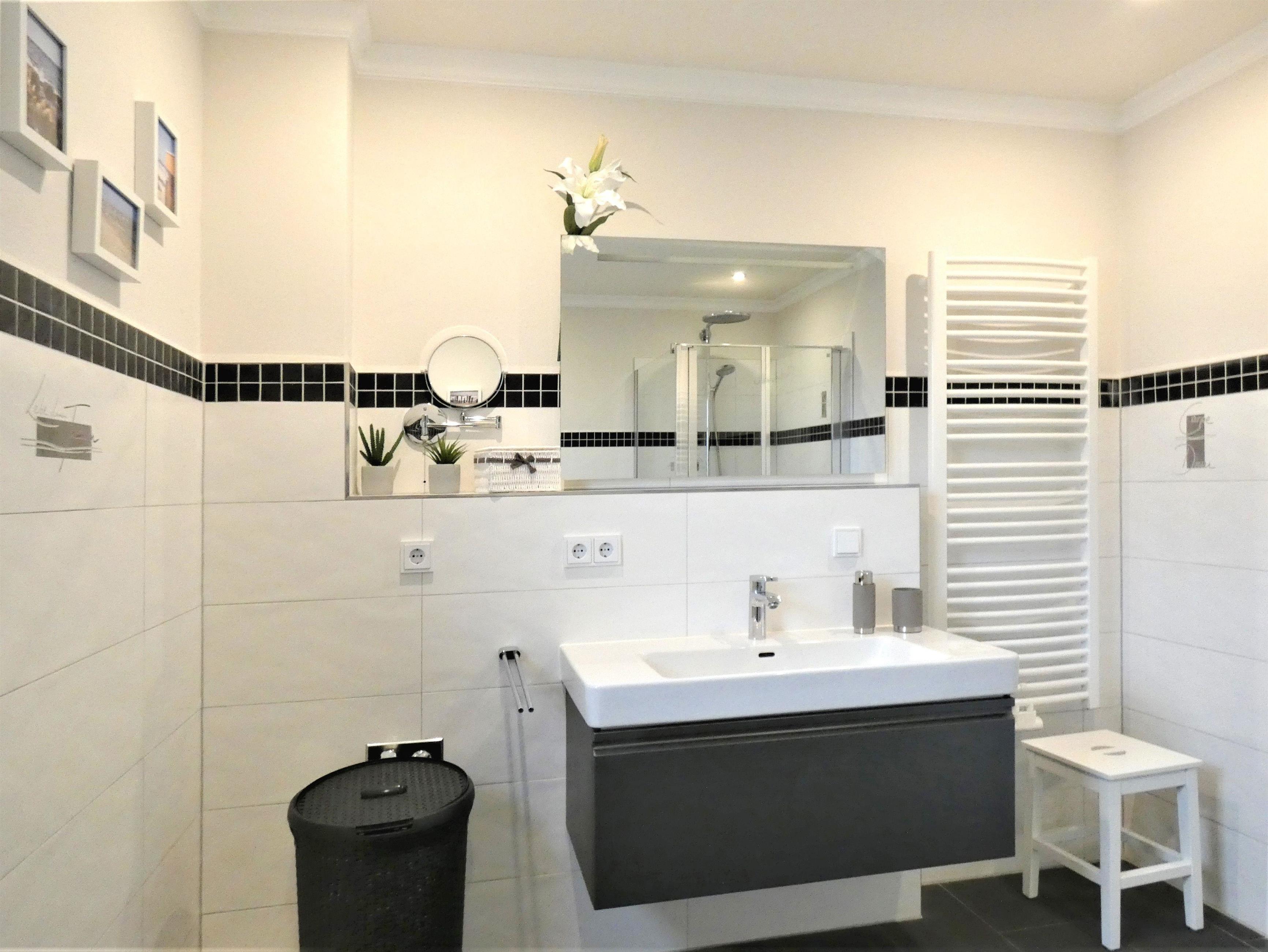 Das helle Tageslichtbad ist modern eingerichtet mit einer Dusche, einem WC, einem Waschbecken mit Unterschrank sowie einem Handtuchheizkörper. Ausreichende Ablagemöglichkeiten für Ihre Badutensilien sind ebenfalls vorhanden.