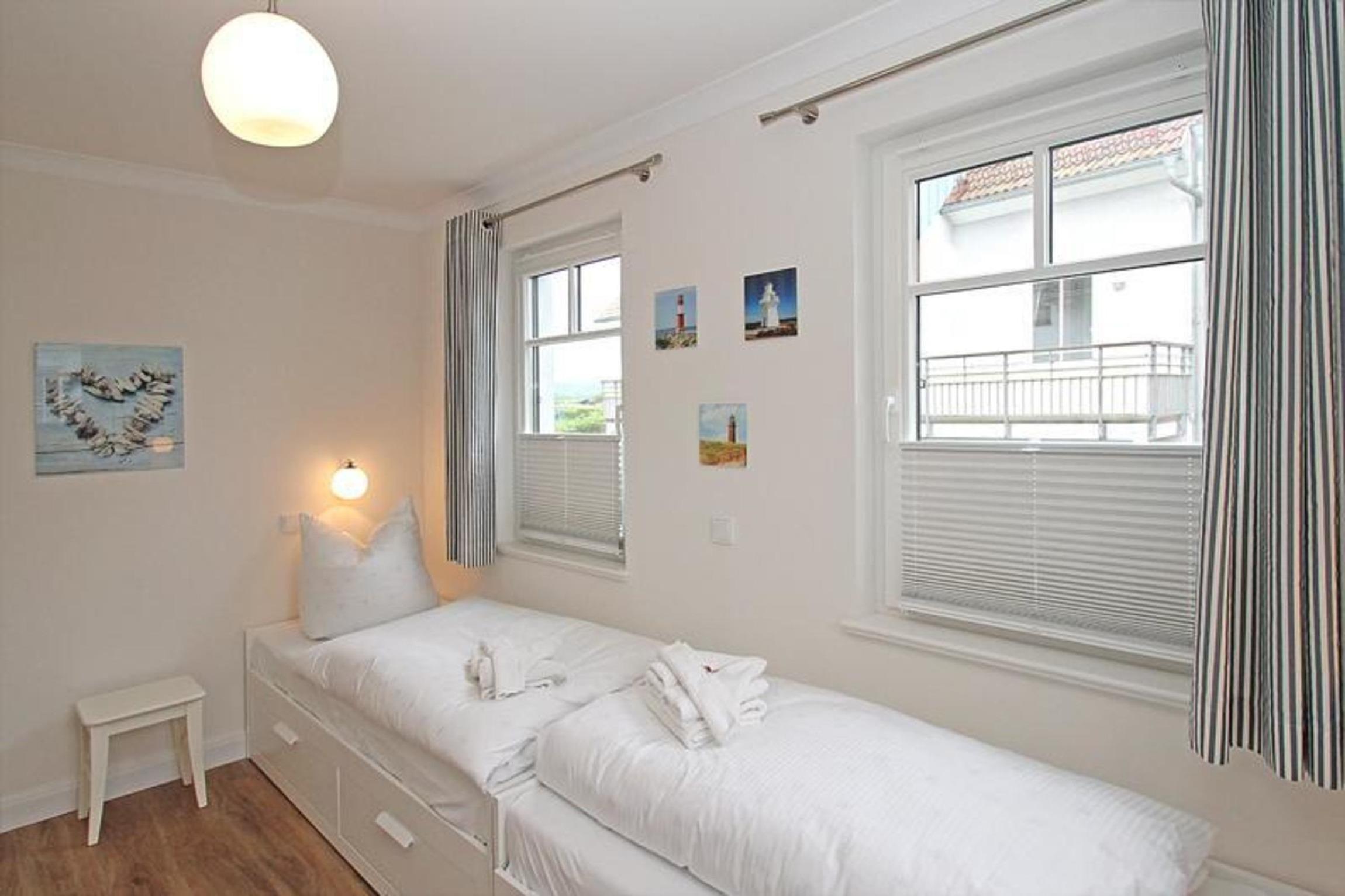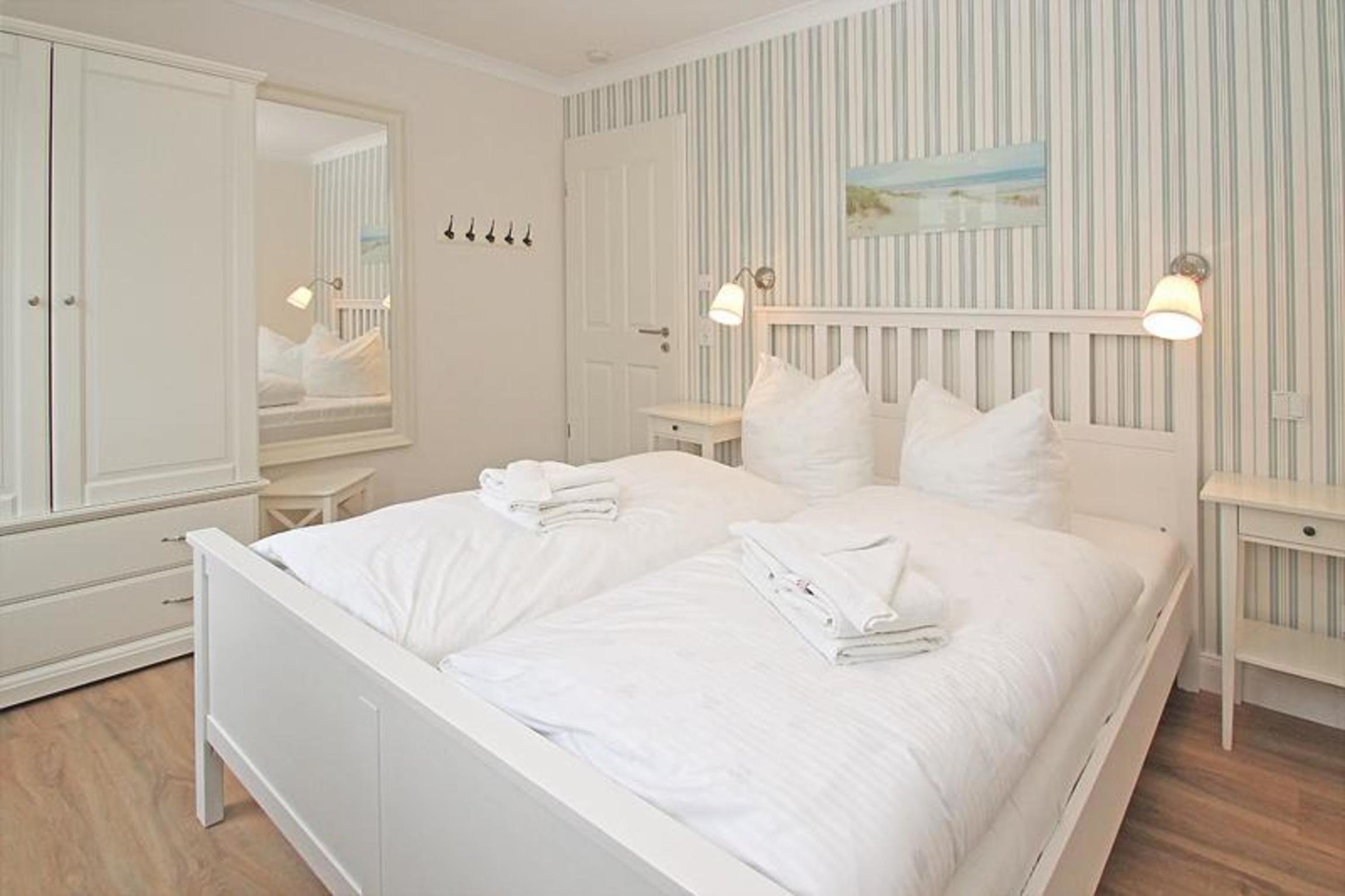 Die geschmackvoll eingerichteten Schlafzimmer bieten Ihnen komfortable Betten und einen geräumigen Kleiderschrank mit viel Platz für Ihre Urlaubsgarderobe. Das erste Schlafzimmer verfügt über ein Doppelbett, das zweite Schlafzimmer über 2 Einzelbetten. Alle Fenster und die Terrassentür sind mit Insektenschutzgittern ausgestattet.