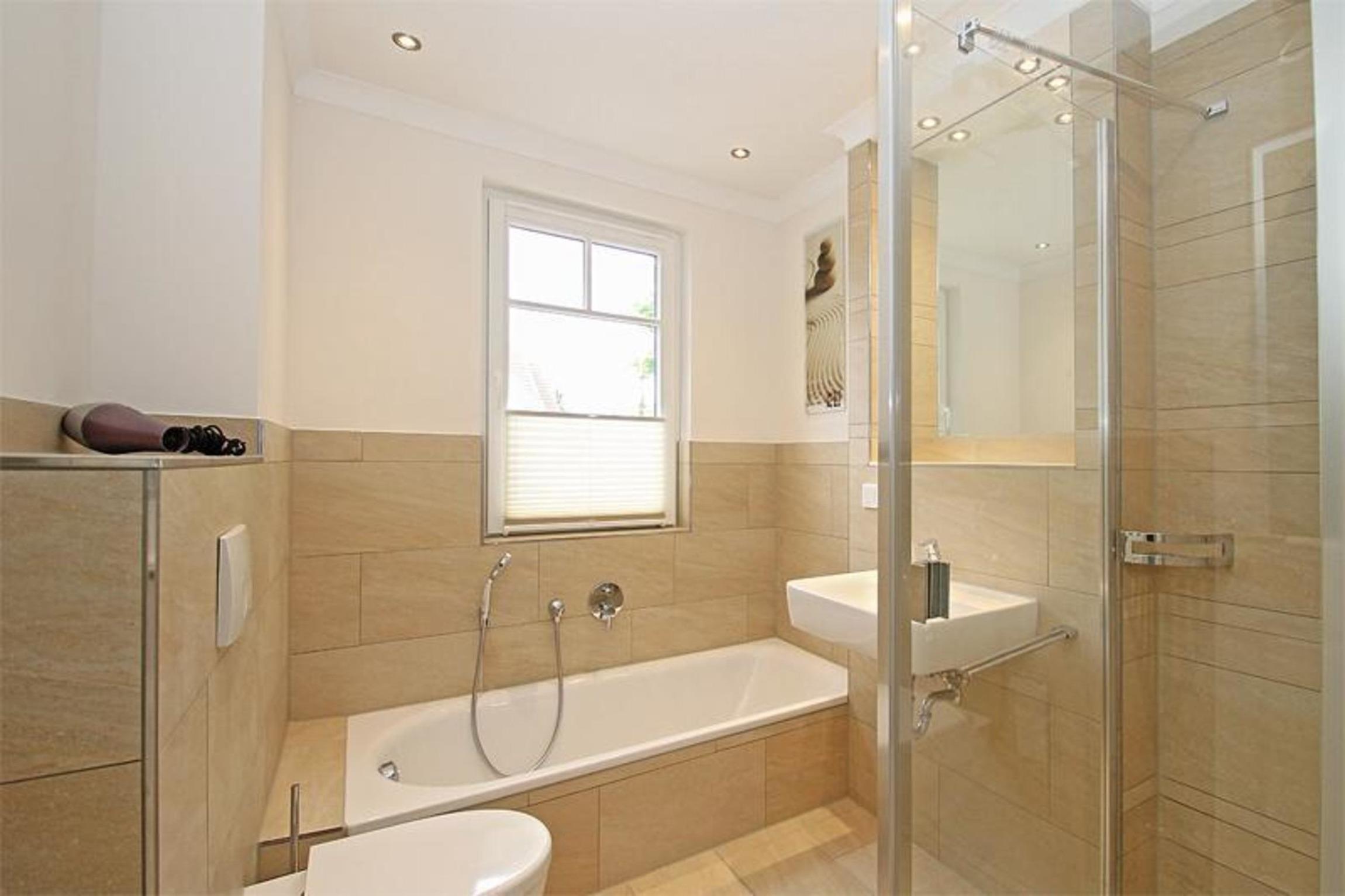 Das helle und moderne Tageslichtbad verfügt über eine Dusche, eine Badewanne, ein WC und ein Waschbecken.