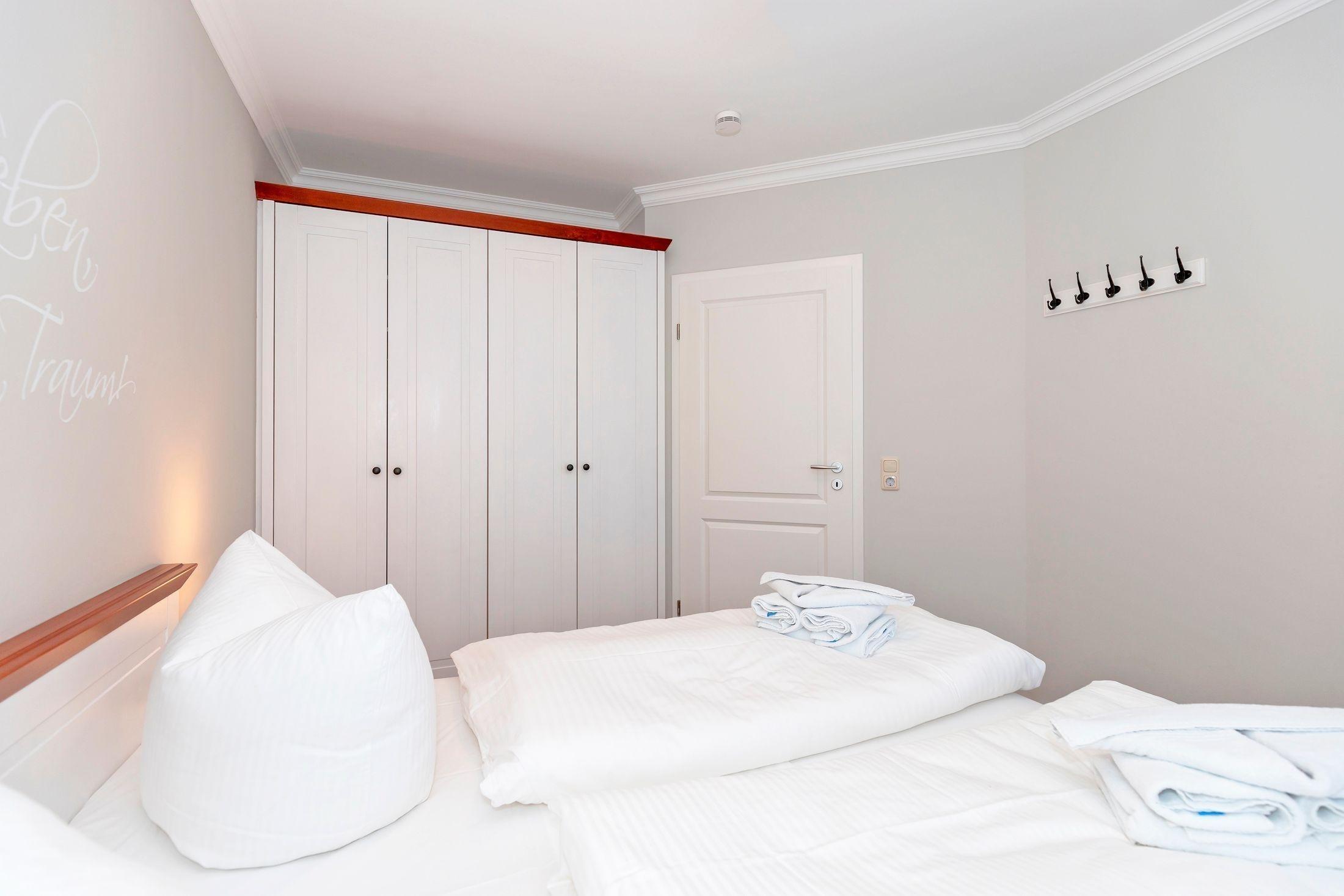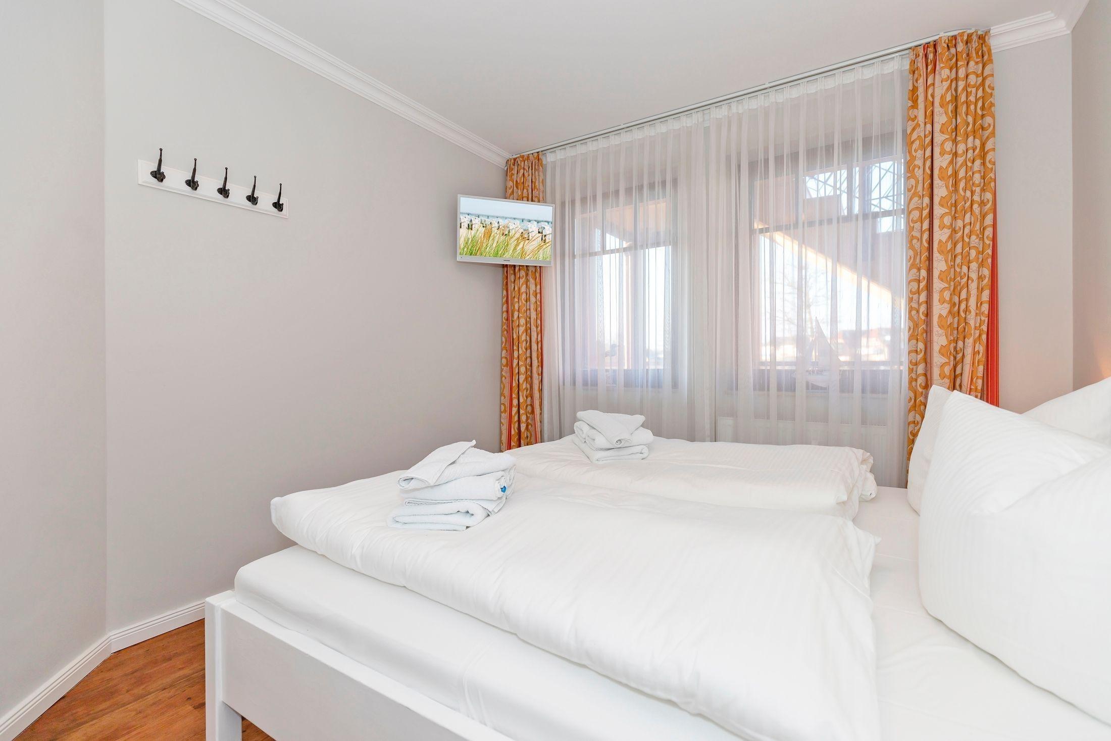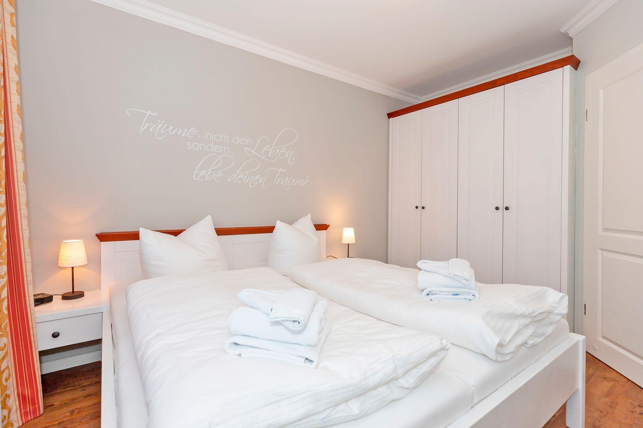 Das Schlafzimmer bietet ein Doppelbett mit Einzelmatratzen und einen dreitürigen Kleiderschrank für Ihre Urlaubsgarderobe. Auch ein zweiter Fernseher steht Ihnen hier zur Verfügung.