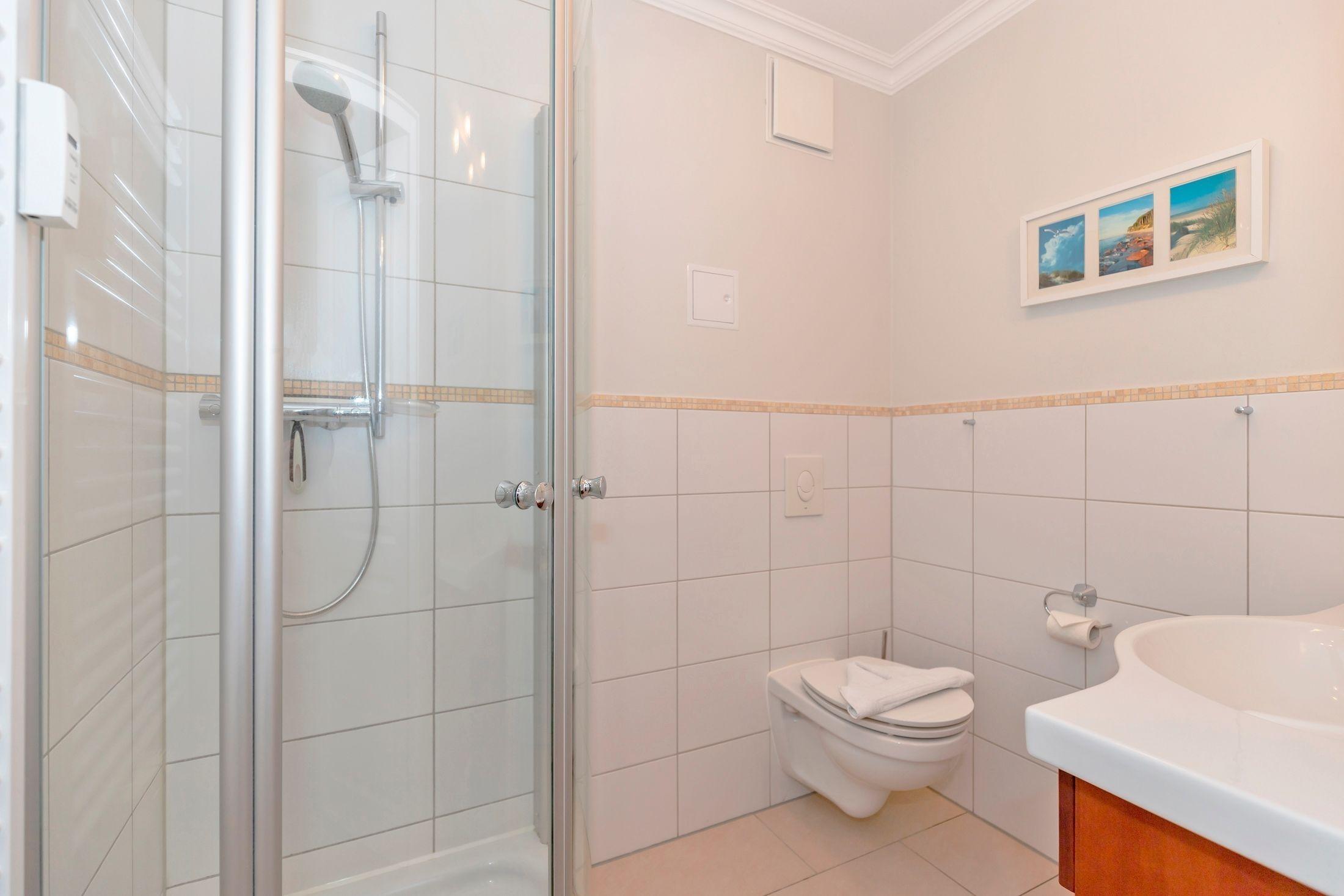 Das geflieste Badezimmer mit Dusche und WC verfügt über eine Fußbodenheizung für die kühlere Jahreszeit und einen Handtuchheizkörper. Unter dem Waschbecken befindet sich eine Ablagemöglichkeit, außerdem ist ein Haartrockner installiert.