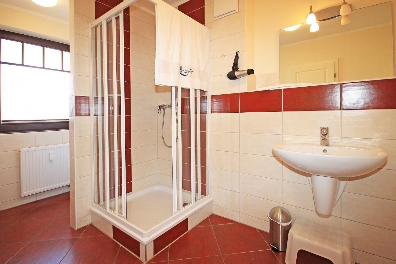 Das moderne Bad ist mit einer Dusche, WC sowie Waschbecken ausgestattet und verfügt über Fußbodenheizung sowie über einen Haartrockner.