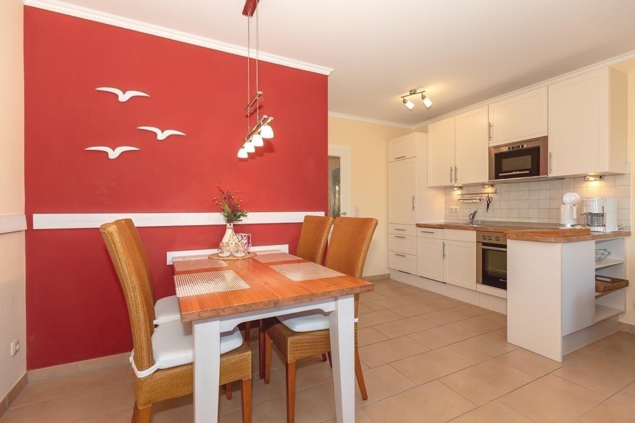 Der abgeschlossene Wohn/ -Küchenbereich besteht aus einer gemütlichen Essecke mit Tisch und 4 Stühlen sowie einer modernen offenen Küche im Landhausstil. Diese ist voll ausgestattet und bietet Ihnen alle Bequemlichkeiten für die Zubereitung Ihrer Mahlzeite.