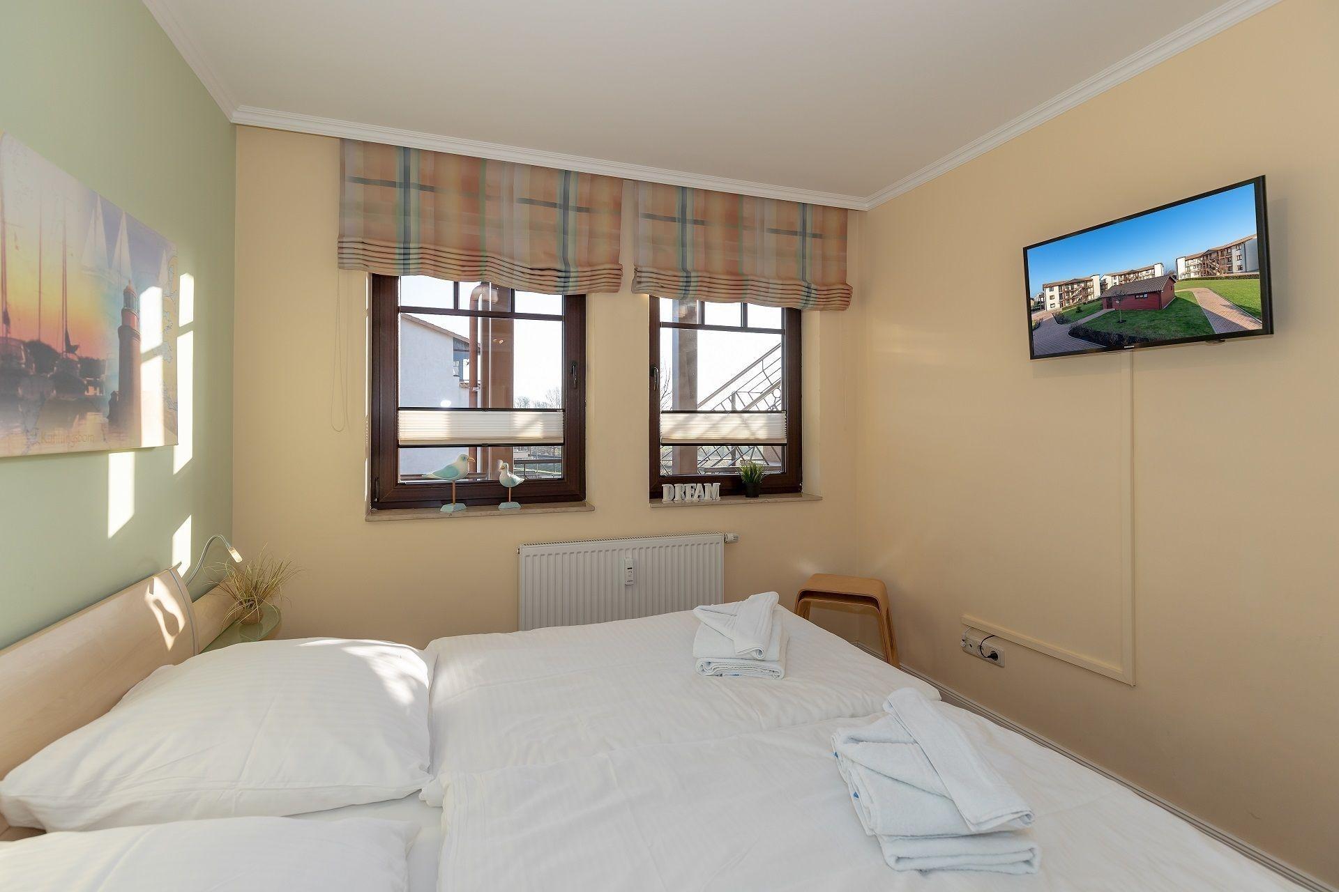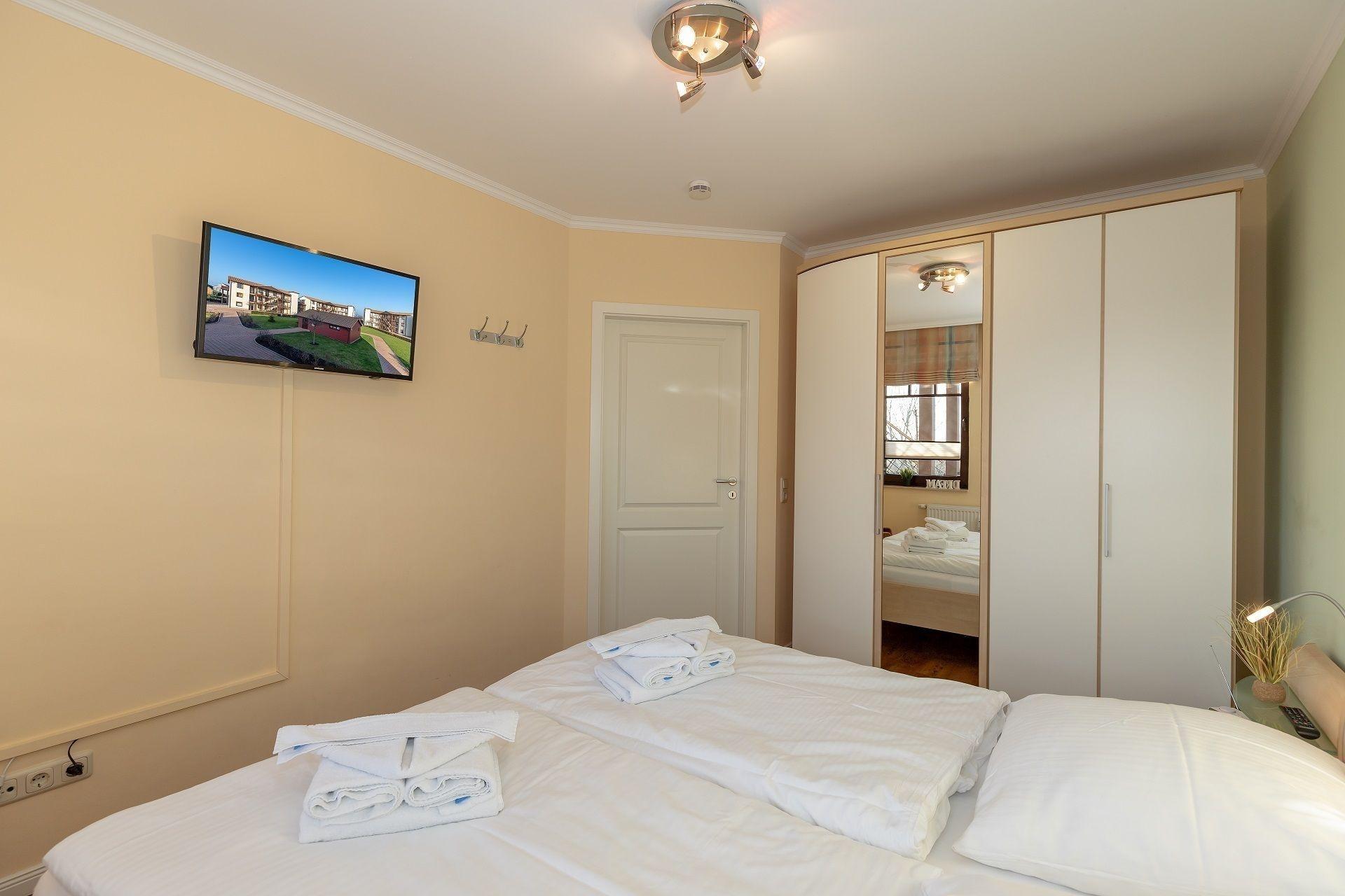 Weiter bietet die Wohnung ein Schlafzimmer mit Komfort-Doppelbett (180 x 200 cm) sowie einen geräumigen Kleiderschrank. Auch hier lädt ein LCD-Flachbildschirm zu einem kuscheligen Fernsehabend ein.
