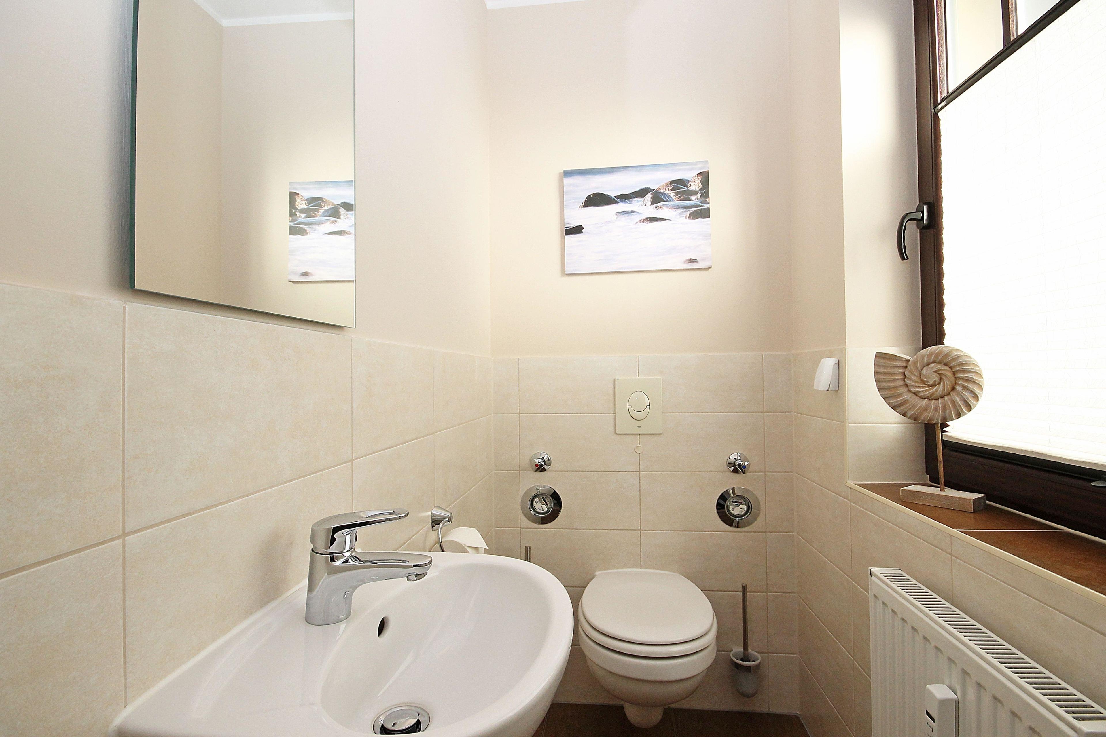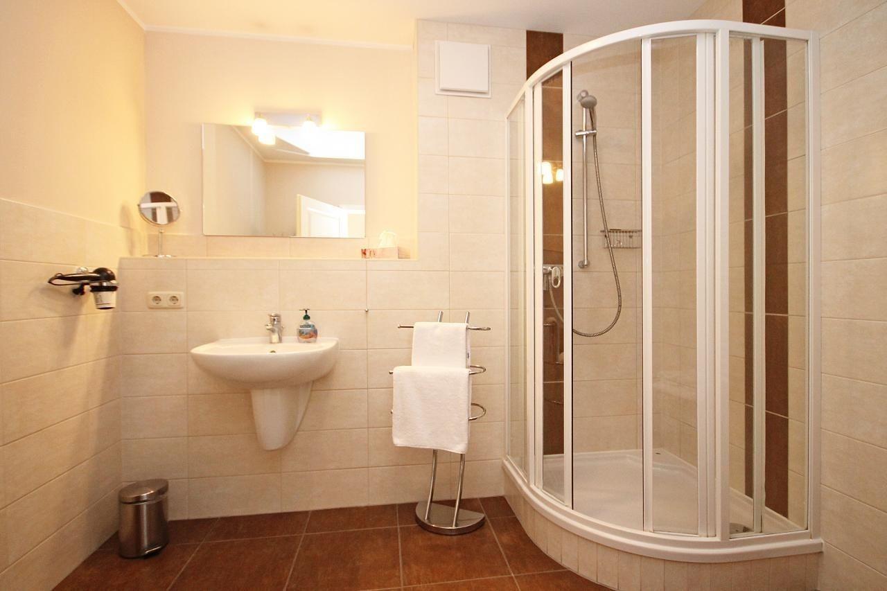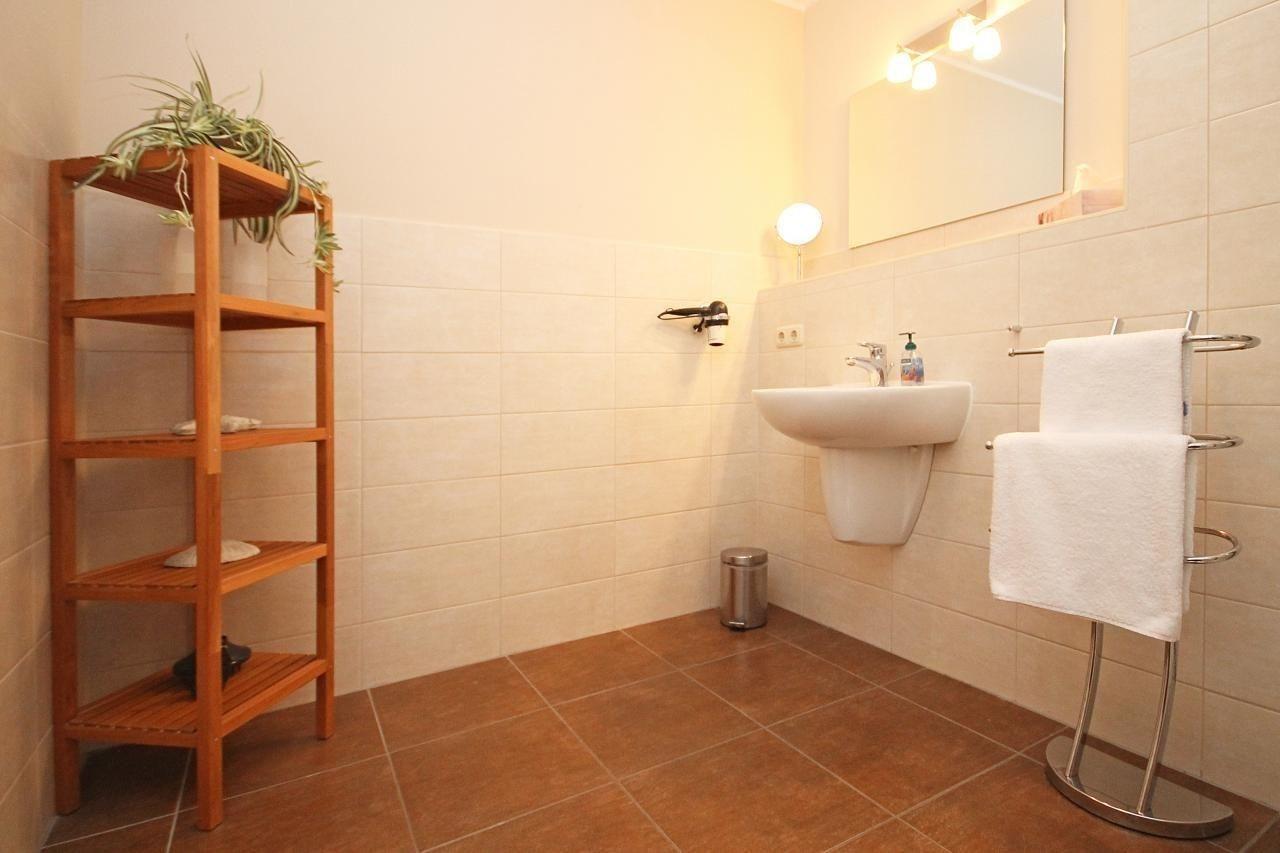 Im großen Badezimmer, welches mit Föhn, Kosmetikspiegel, beleuchtetem Spiegel, Handtuchheizkörper und Dusche ausgestattet ist, finden Sie viel Platz. Das WC befindet sich separat in einem weiteren Raum.