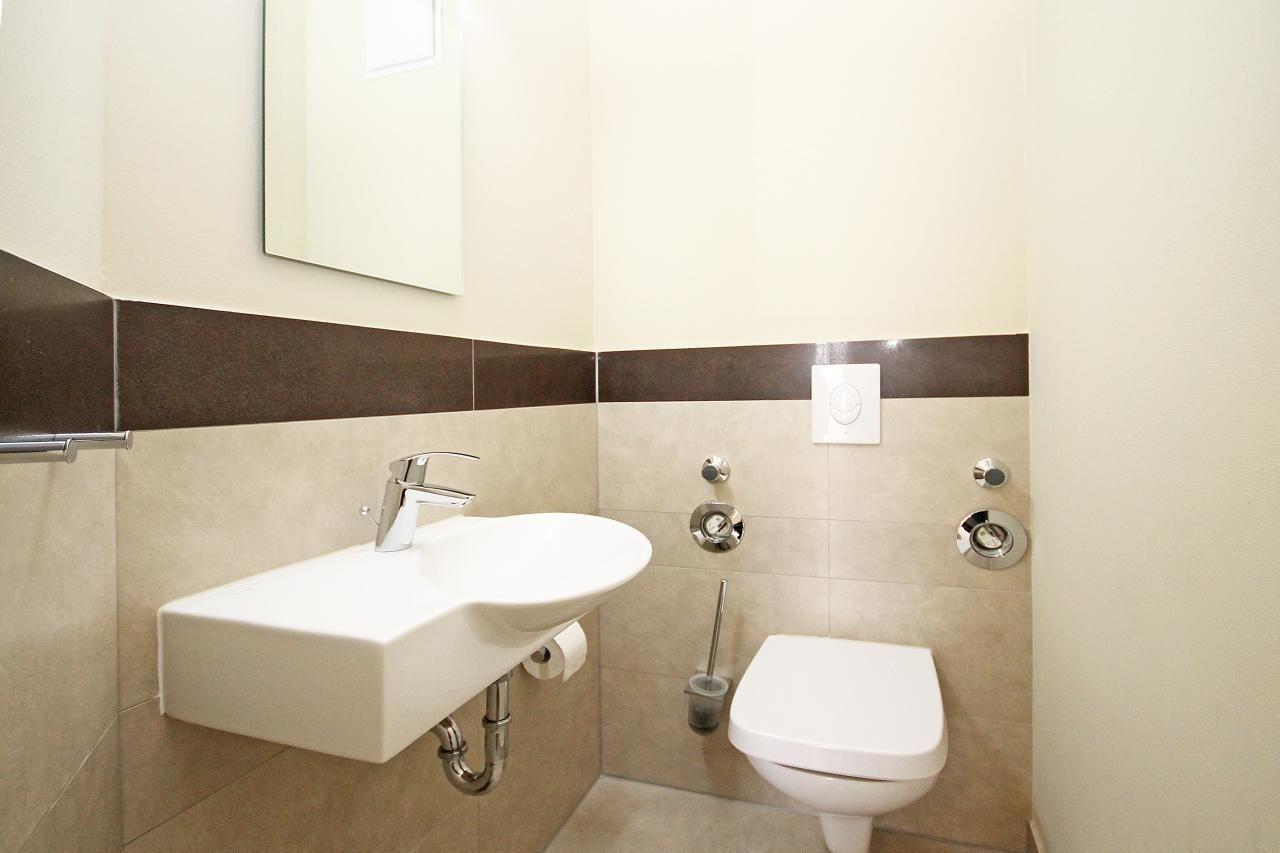 Im stilvoll ausgestatteten Bad können Sie unter der Dusche (80 x 90 cm) entspannen und finden neben dem Handtuchheizkörper einen Kosmetikspiegel, einen Föhn sowie einen Waschtisch mit Platz zum Verstauen und Ablegen. Das gleichermaßen geflieste WC mit einem großzügigen Waschbecken befindet sich separat.