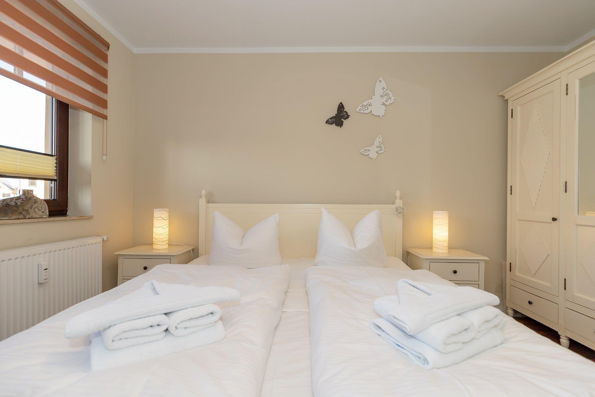 Das angrenzende Schlafzimmer bietet Ihnen angenehme Stunden im großzügigen Doppelbett mit zwei separaten allergikerfreundlichen Matratzen sowie verstellbaren Kopf -und Fußteilen, so dass Sie auch vom Bett aus bequem Ihre Lieblings-TV-Sendung im Schlafzimmer genießen können. Im geräumigen Kleiderschrank und in den zwei Nachtkonsolen finden Sie genügend Stauraum für Ihre Urlaubsgarderobe.