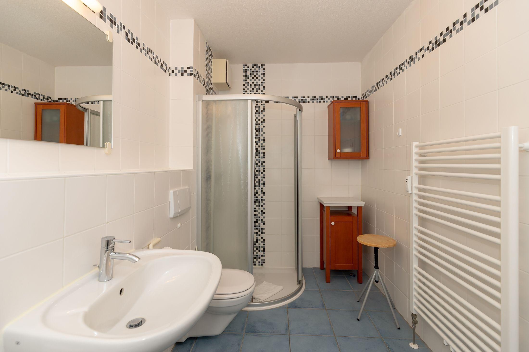 Das Badezimmer ist mit einer ebenerdigen Dusche, einem WC, einem Waschbecken, einem Handtuchheizkörper und einem Wäschetrockner ausgestattet.