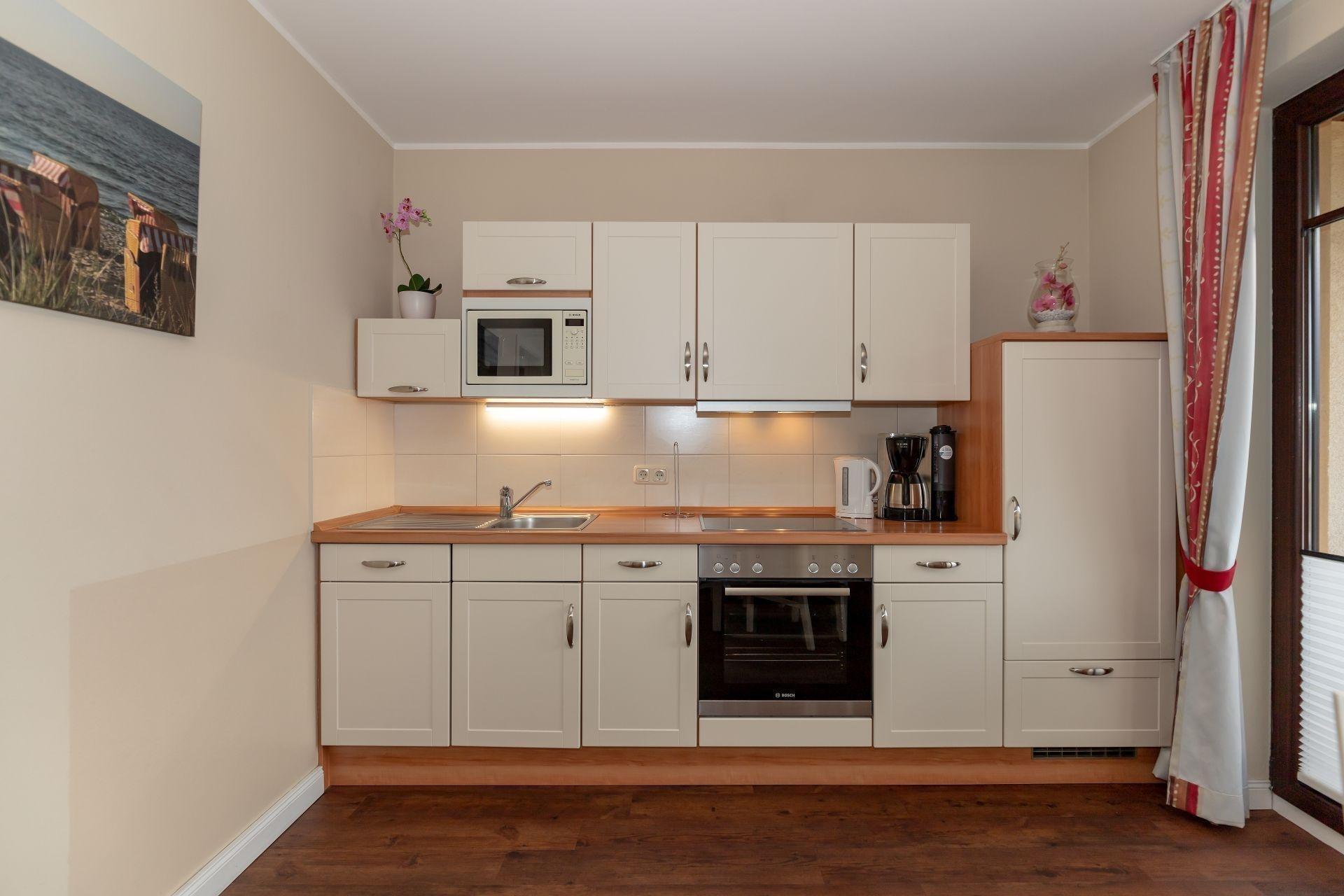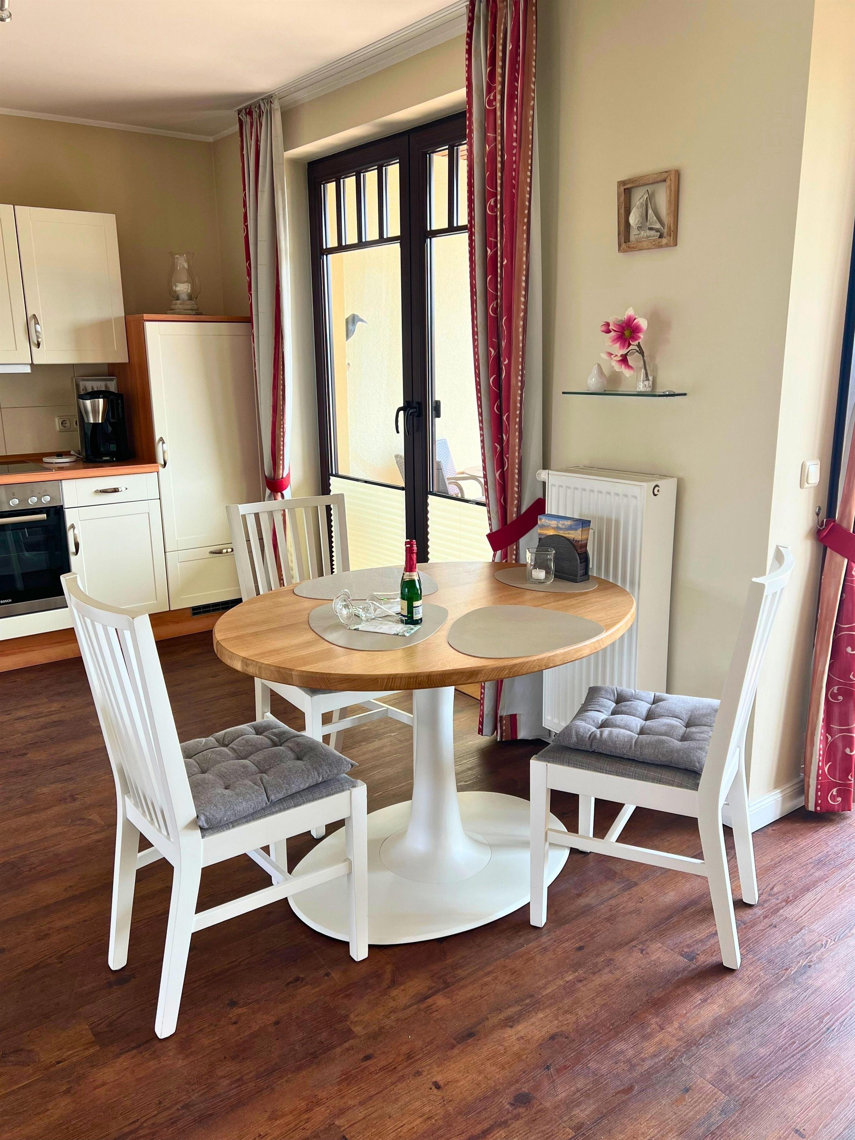 An den Wohnbereich grenzt der schöne Holz-Esstisch. Genießen Sie ein gemütliches Frühstück oder am Abend das perfekte Dinner...Die Küche ist mit einem Ceran-Kochfeld, einem Backofen, einem Geschirrspüler, einer Mikrowelle und einem Kühlschrank mit Gefrierfach ausgestattet. Des Weiteren gehören eine Kaffeemaschine, ein Wasserkocher, ein Toaster genauso zum Inventar wie ausreichend Besteck und Geschirr.