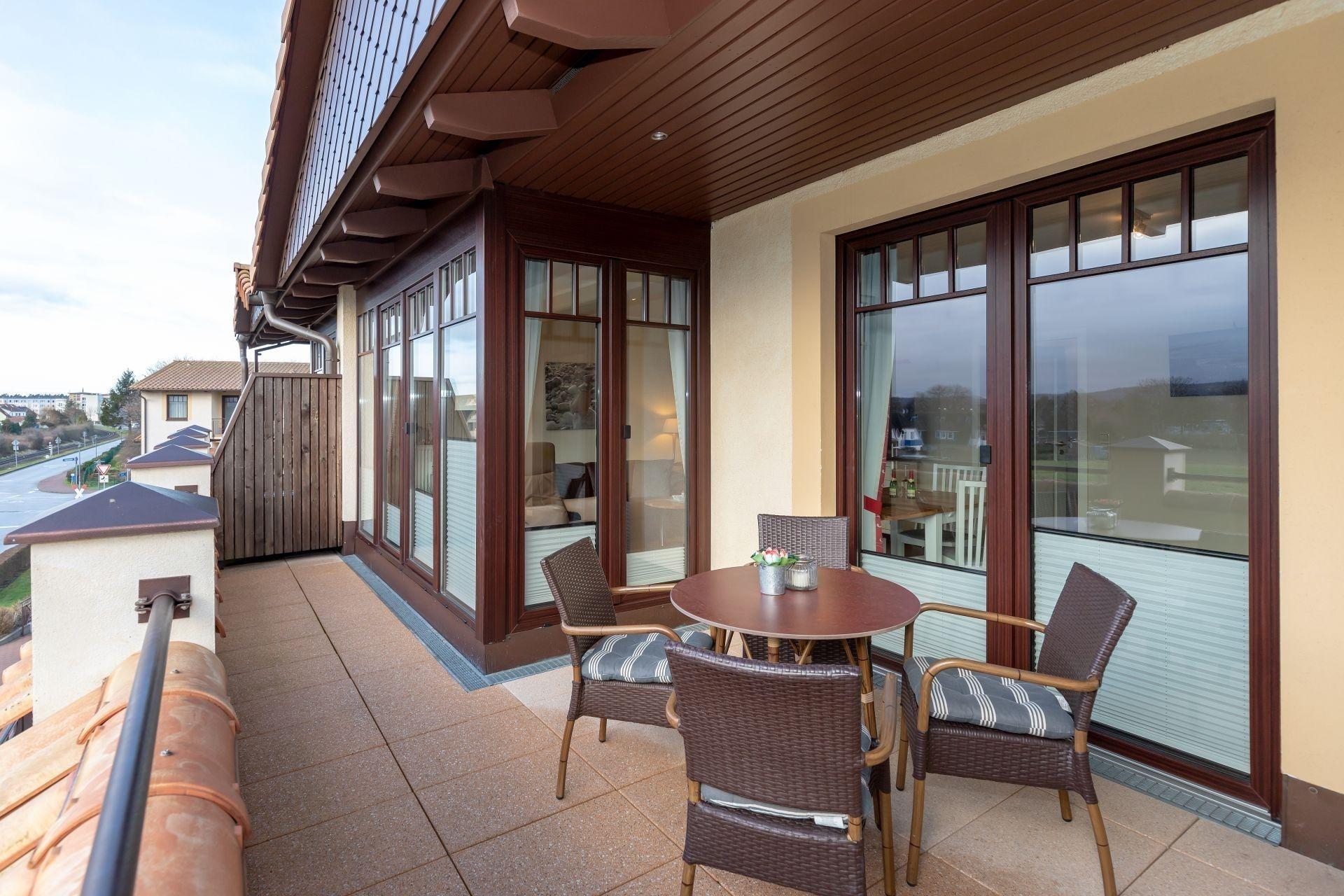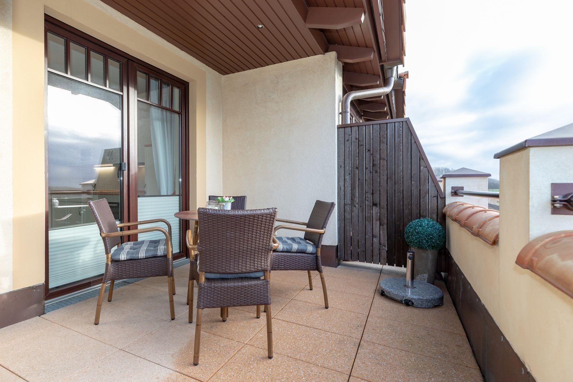 Auf dem windgeschützten Süd-Balkon können Sie bereits am Morgen den Tag mit einem gemütlichen Frühstück starten und schöne sonnige Stunden verbringen. Von hier aus schauen Sie direkt ins Grüne und können auch die Pferde, die Rehe oder die beliebte Schmalspurbahn "Molli" beobachten. Es stehen Ihnen Balkonmöbel sowie 2 Liegen zur Verfügung.