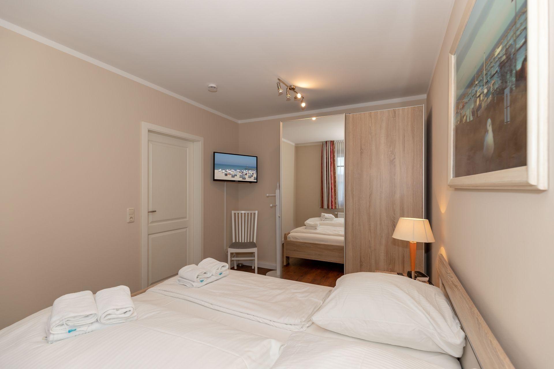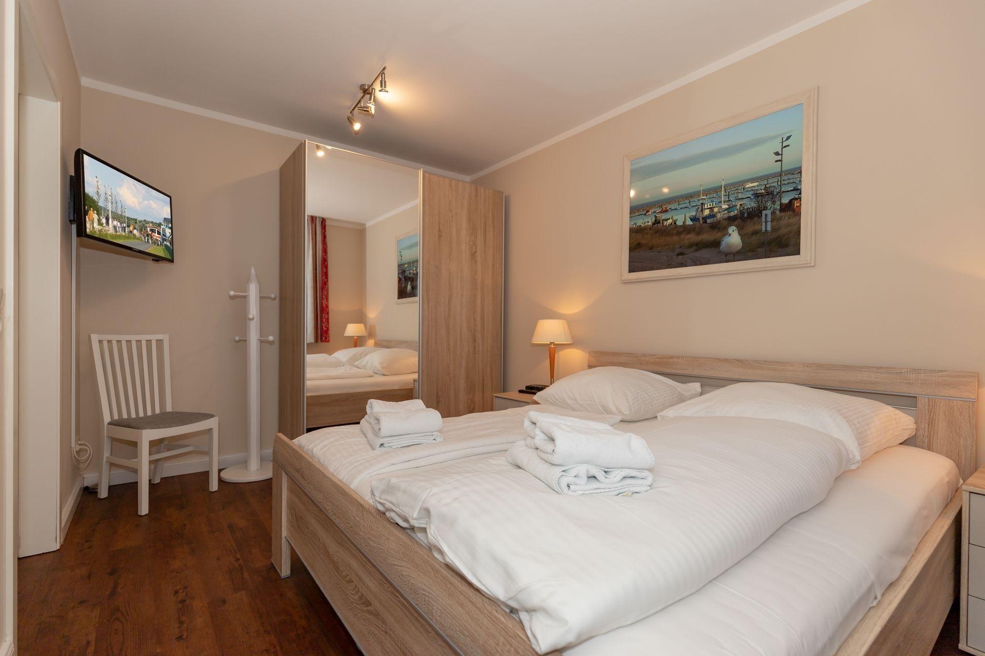 Im Doppelbett können Sie Ihren persönlichen "Urlaubs-Traum" erleben. Für Ihre Urlaubsgarderobe steht Ihnen der Kleiderschrank zur Verfügung. Ein zweiter Fernseher im Schlafzimmer ist ebenfalls vorhanden. Ein Kinderreisebett passt problemlos in das Schlafzimmer mit rein und kann gerne bei uns mitgebucht werden.