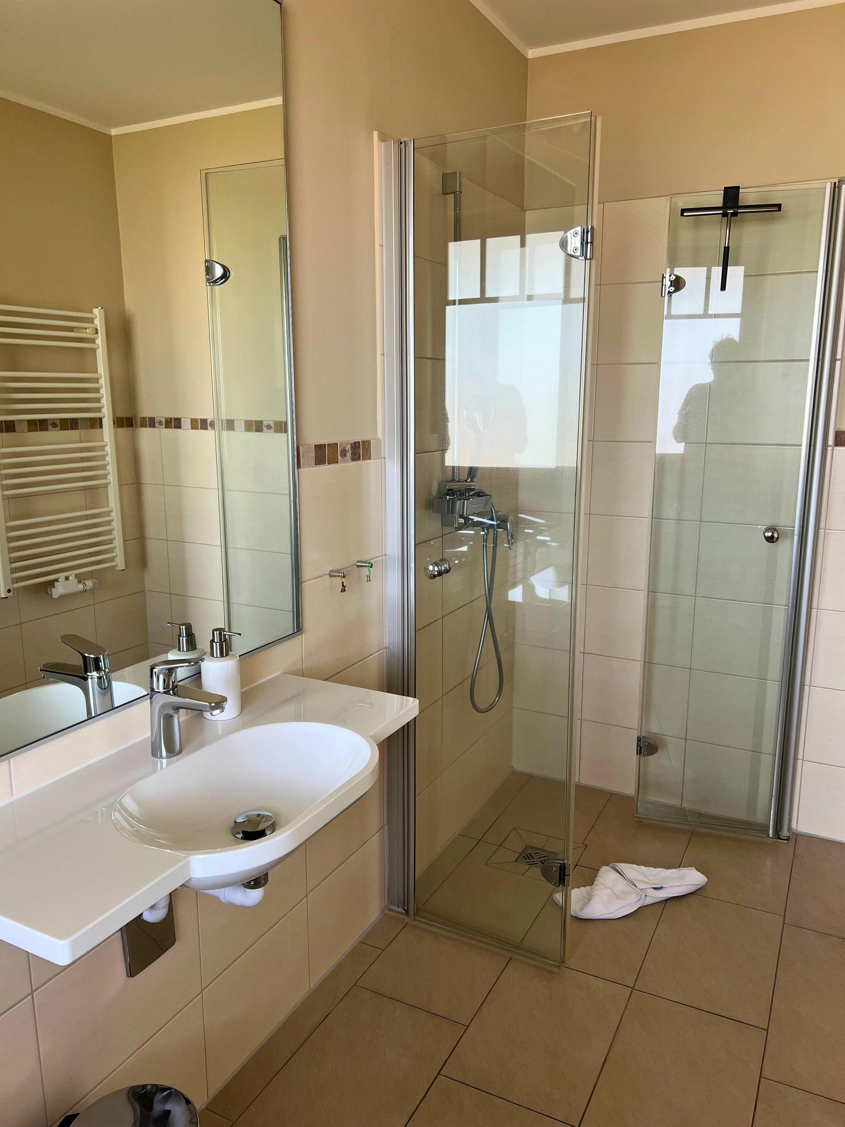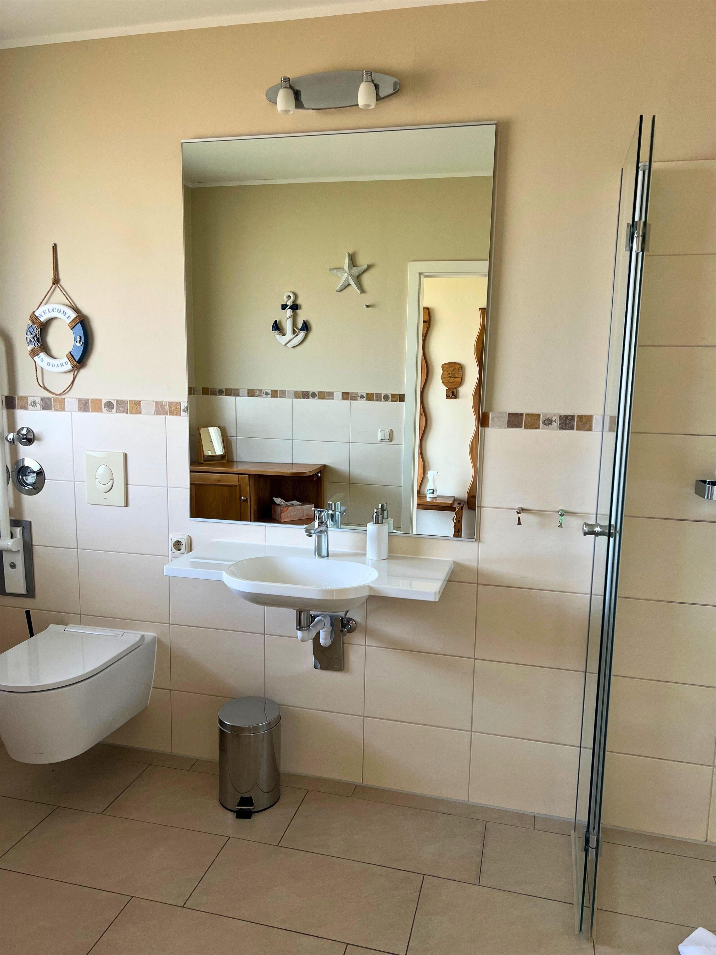 Im hellen Tageslicht Bad können Sie unter der breiten und barrierefreien Dusche entspannen. Ein Duschstuhl steht ebenfalls zur Verfügung. Das Waschbecken ist für Rollstuhlfahrer unterfahrbar, zudem wurde ein Griff bei der Toilette montiert. Des Weiteren finden Sie einen mobilen Haltegriff den Sie sich anbauen können, wo sie ihn benötigen. Selbstverständlich finden Sie im schönen Holzschränkchen auch ausreichend Platz für Ihre Kosmetikartikel.