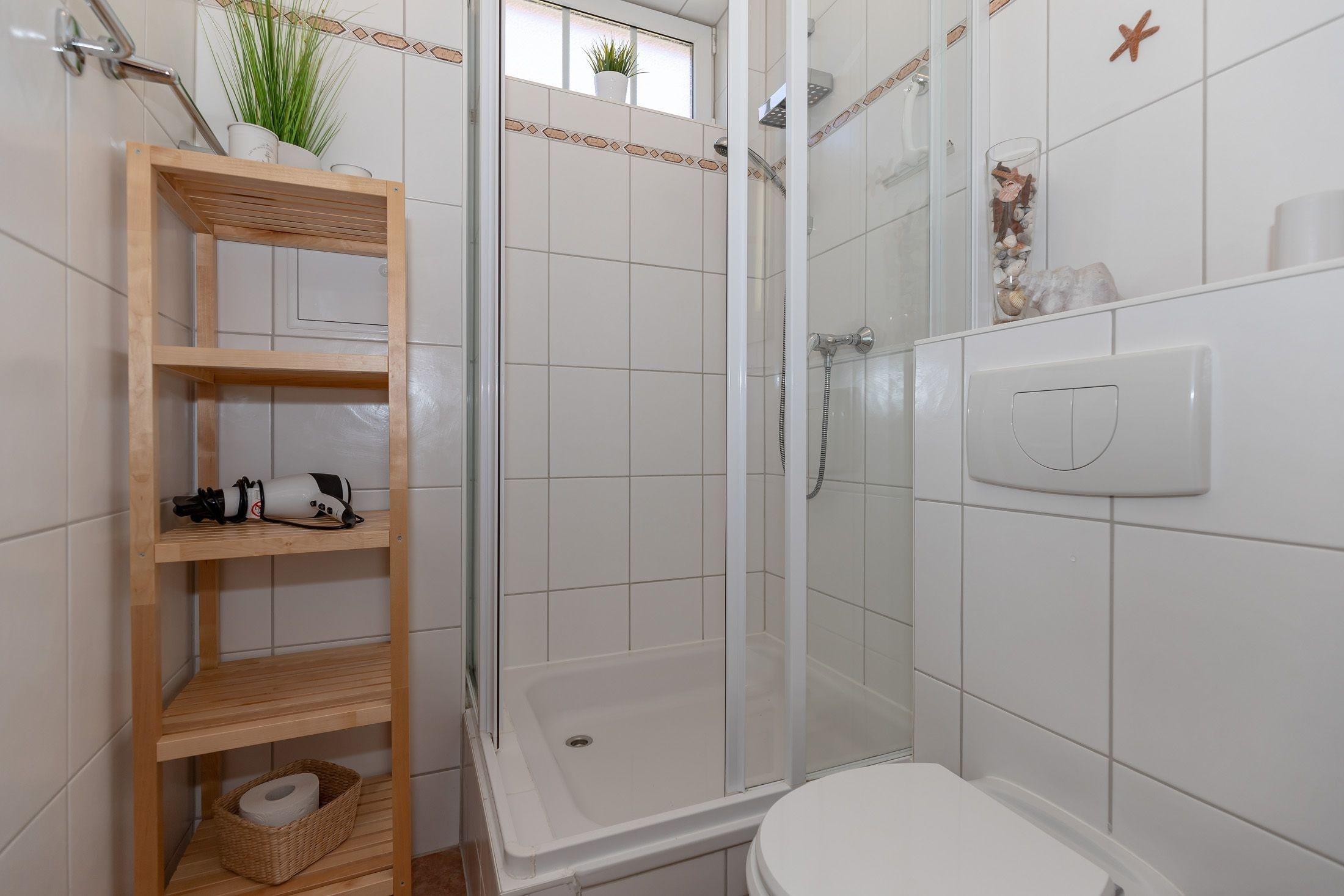 Das Badezimmer mit Tageslicht verfügt über eine Dusche, ein Waschbecken, ein WC und einen Handtuchheizkörper. Für Ihre Badutensilien stehen Ihnen ausreichend Ablagemöglichkeiten zur Verfügung. Ein Föhn ist ebenfalls vorhanden.