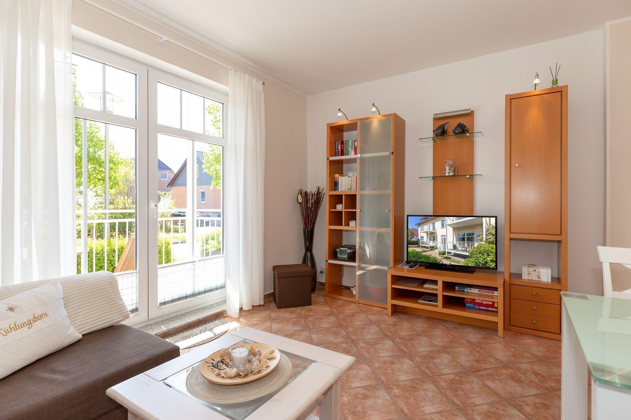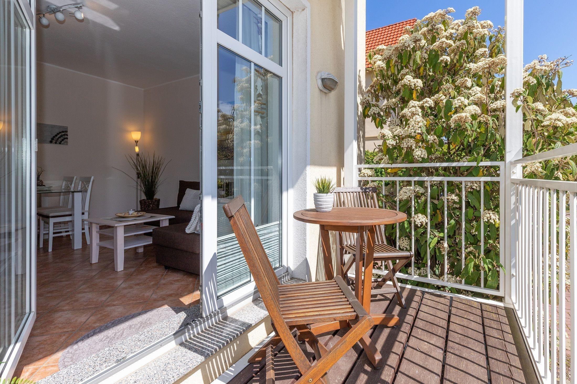 Vom Wohnzimmer aus gelangen Sie auf den ansprechenden Balkon, der zur Südseite gelegen ist. Auf dieser kleinen Wohlfühloase können Sie die Sonne genießen und einen ereignisreichen Urlaubstag bei einem leckeren Getränk gemütlich ausklingen lassen.