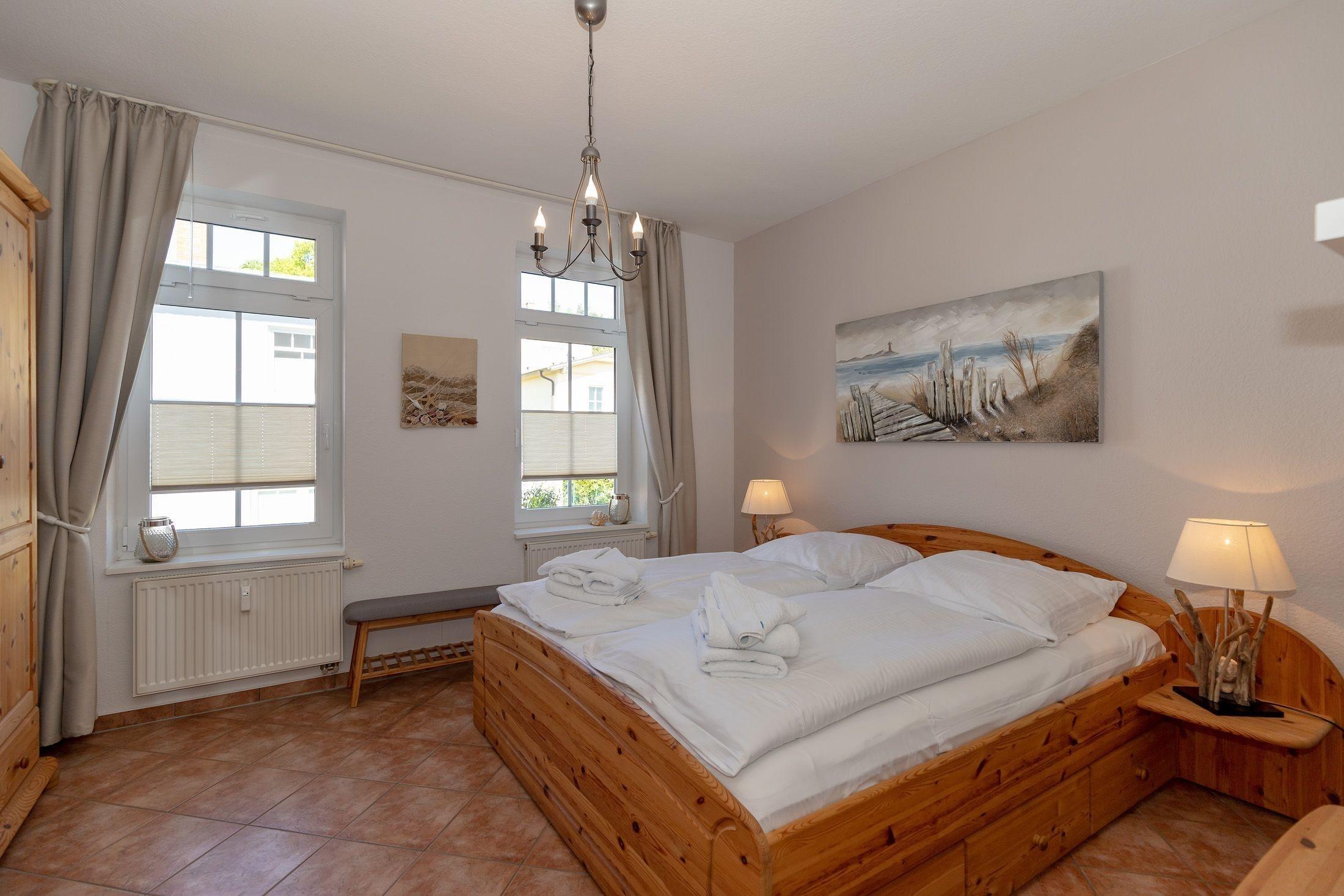 Das Schlafzimmer verfügt über ein komfortables Doppelbett, ein erholsamer Schlaf ist somit garantiert. Ein geräumiger Kleiderschrank mit Spiegel bietet ausreichend Platz für Ihre Urlaubsgarderobe.