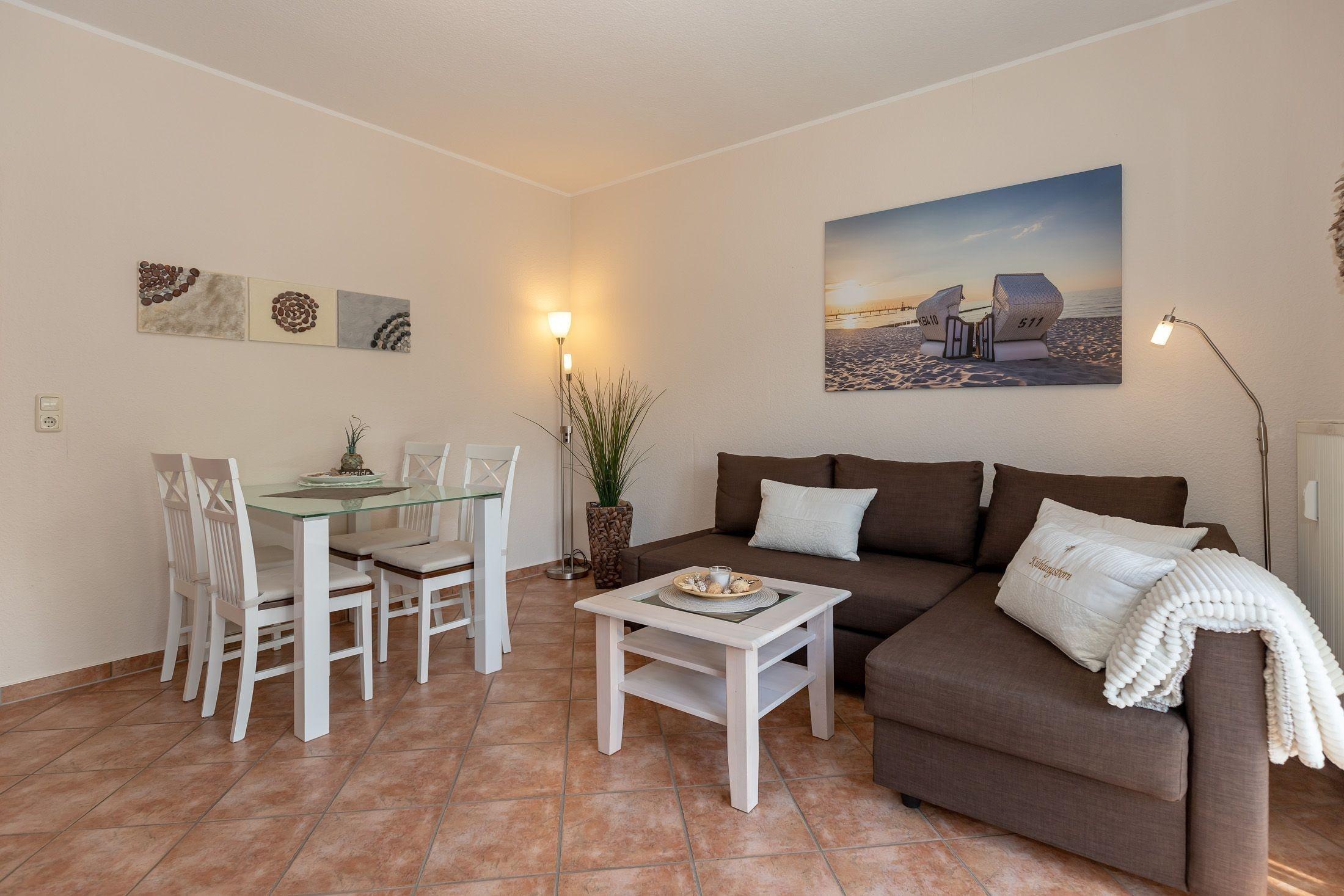 Im Wohnzimmer befindet sich eine gemütliche Couchgarnitur, die zu gemütlichen Stunden einlädt. Für Ihre abendliche Unterhaltung sorgt ein Flachbildschirm-Gerät. Am vorhandenen Esstisch können Sie Ihre Mahlzeiten genießen oder einen fröhlichen Spielabend verbringen.