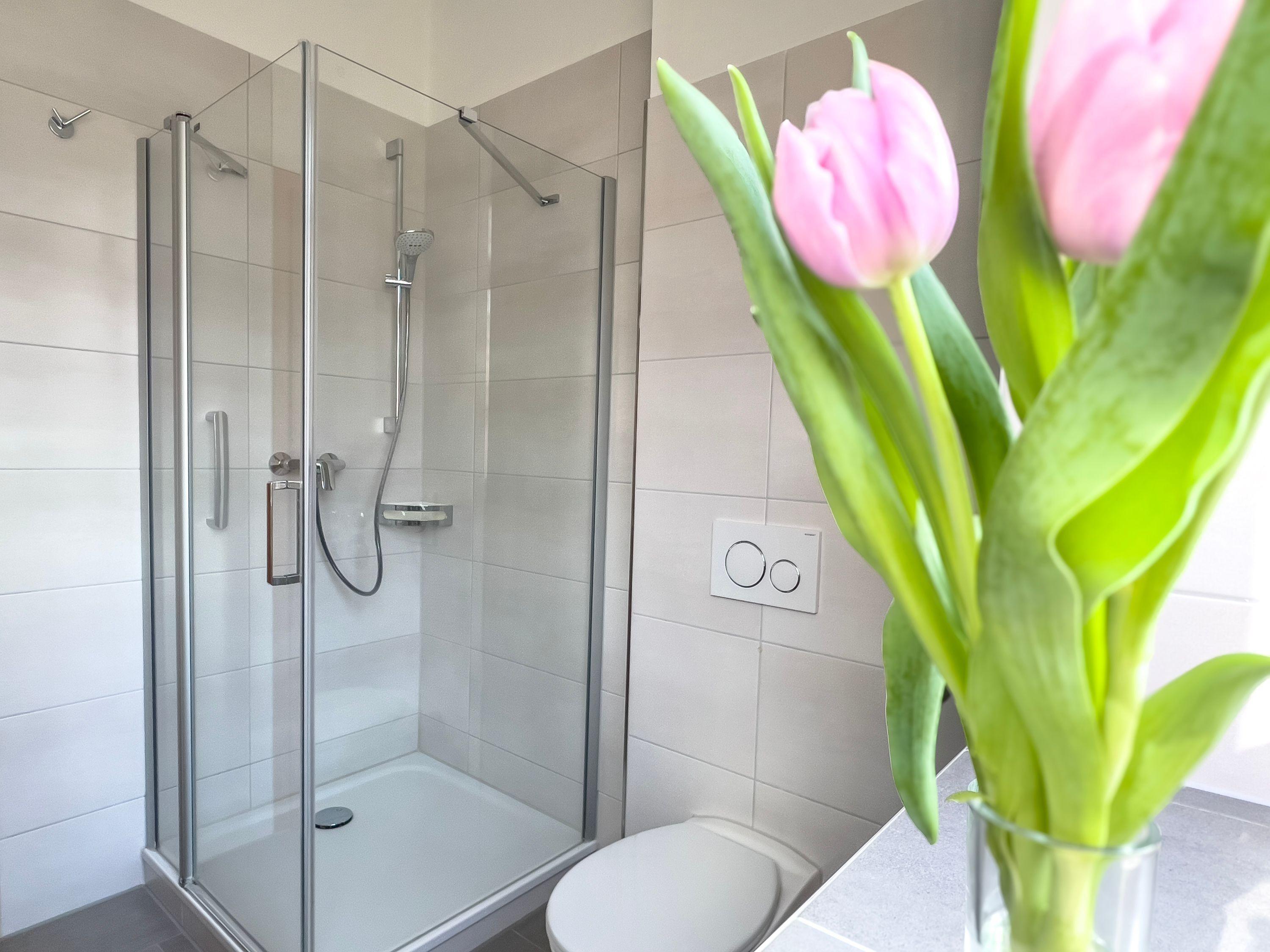 Das moderne Badezimmer mit Fenster verfügt über eine Dusche, ein WC, ein Waschbecken mit Unterschrank sowie einen Handtuchheizkörper. Ihre Badutensilien finden Platz auf ausreichend vorhandenen Abstellflächen.