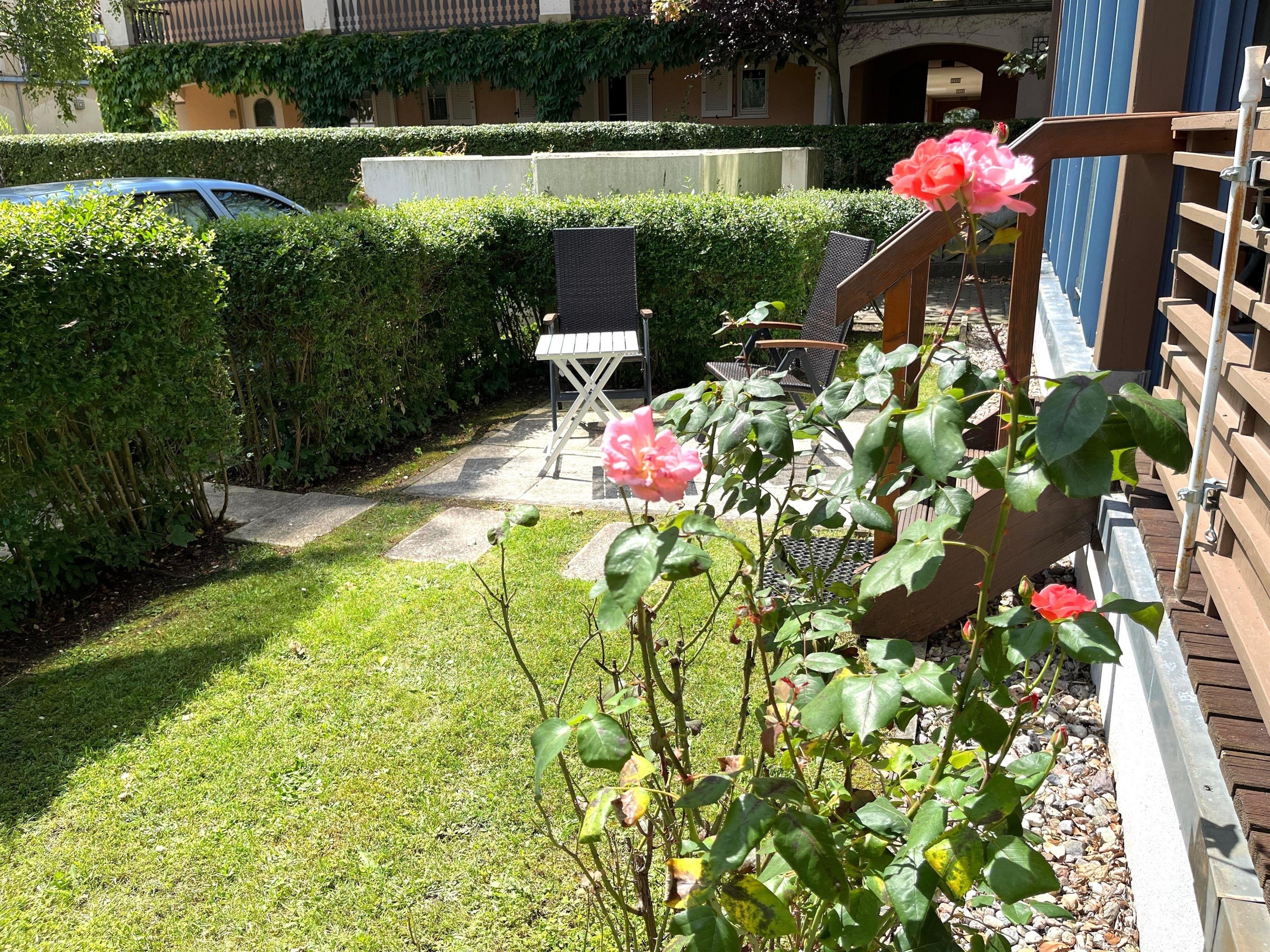 Vom Wohnzimmer und vom Schlafzimmer aus kann man die hübsche sonnige Terrasse betreten. Sie ist mit bequemen Terrassenmöbeln ausgestattet und lädt zum Verweilen und Relaxen ein. Die Terrasse richtet sich nach Osten. Es gehört sogar ein kleines Stück Rasen mit weiterer Sitzgelegenheit zur Wohnung, das von der Terrasse aus zu betreten ist. Eine Wohlfühloase für die ganze Familie.