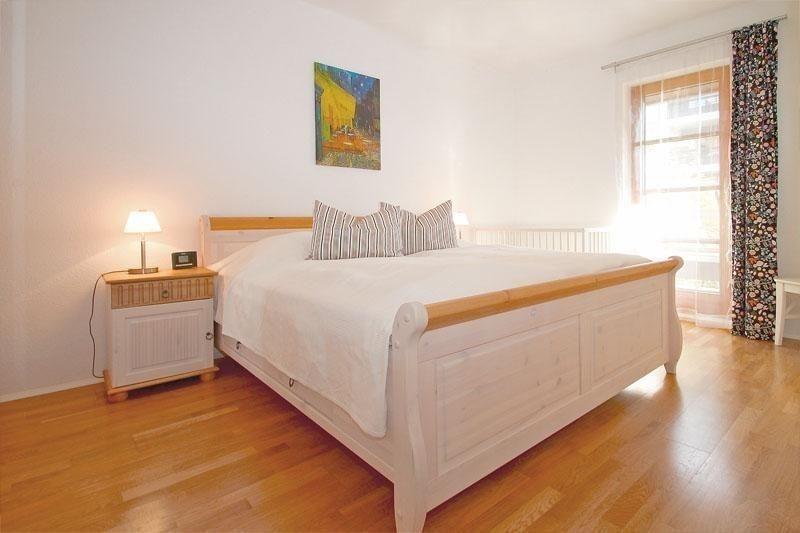 Das Schlafzimmer, ebenso wie das Wohnzimmer, verfügt über einen eigenen Zugang zur Terrasse. In dem großen Doppelbett werden Sie einen erholsamen Schlaf finden. Ein geräumiger Kleiderschrank bietet viel Platz für die mitgebrachte Urlaubsgarderobe.