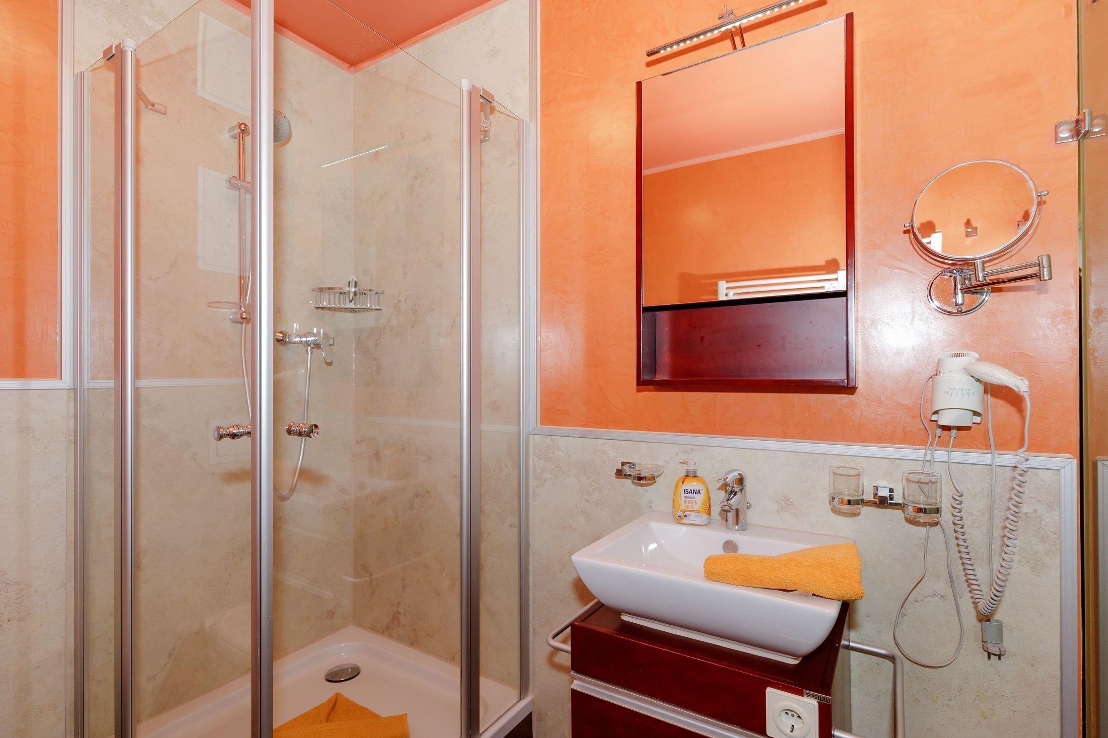 Das ansprechende Badezimmer im mediterranen Stil verfügt über ein WC , eine Glas-Duschkabine mit Regendusche und Handbrause sowie einen Handtuchheizkörper.