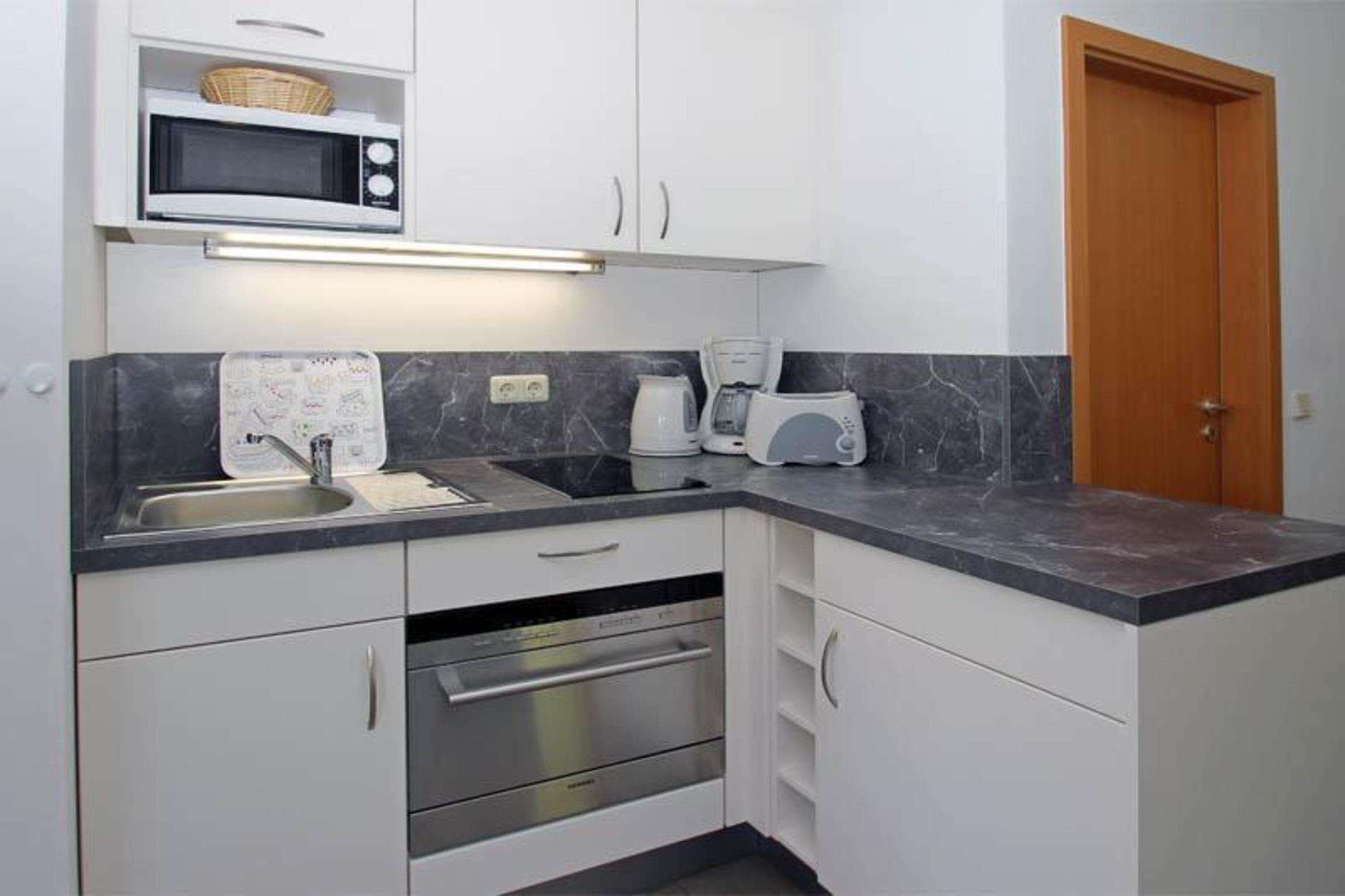 An den Wohnbereich grenzt die Küche, die voll ausgestattet ist mit Geschirrspüler, Kühlschrank, 2-Platten-Ceranfeld, Mikrowelle, Toaster, Kaffeemaschine, Wasserkocher und natürlich genügend Geschirr.