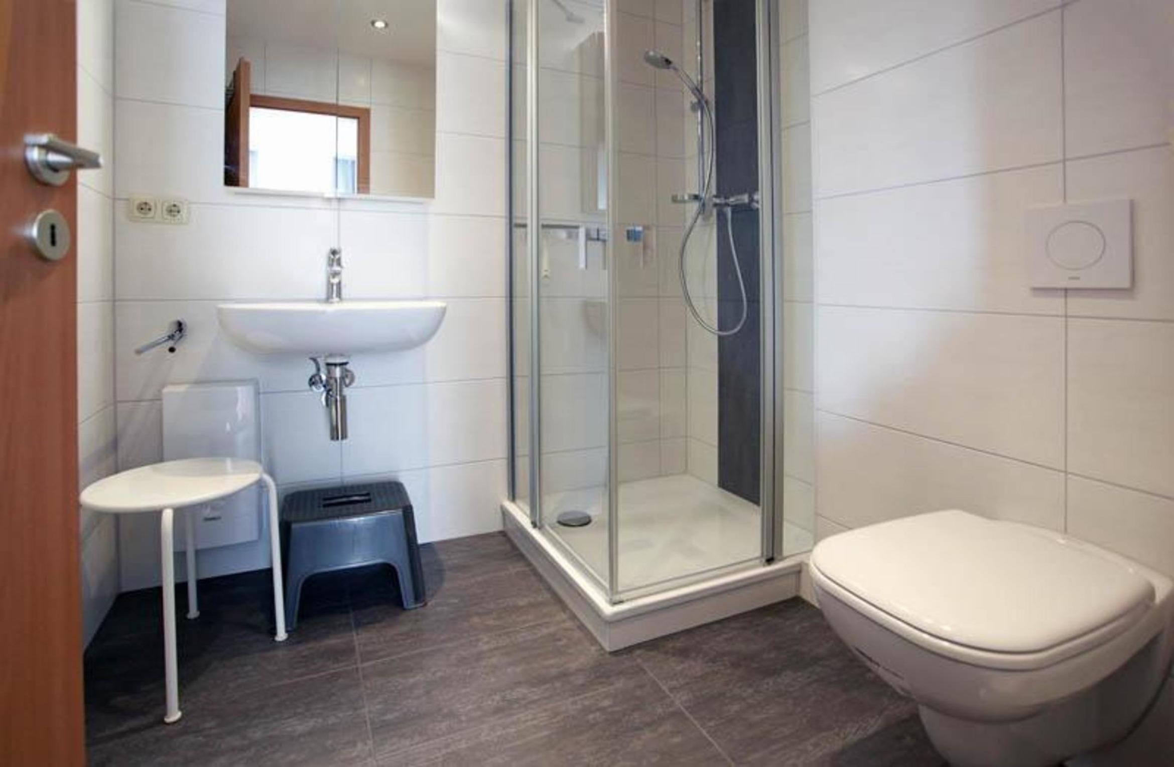Das Badezimmer ist mit einer Dusche mit niedrigem Einstieg, einem Waschbecken und einem WC ausgestattet.