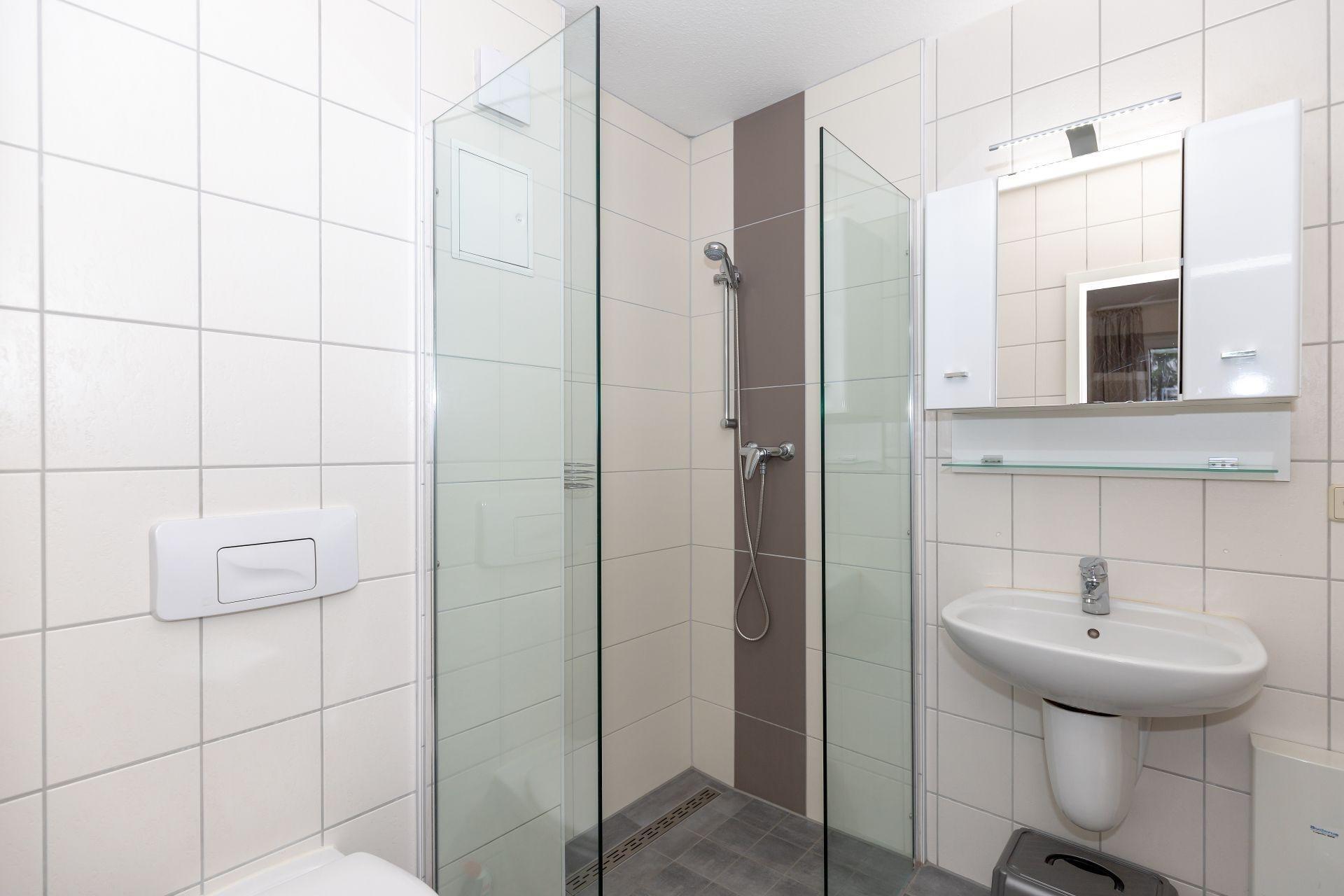 Das Badezimmer verfügt über eine Dusche, ein Waschbecken und ein WC.