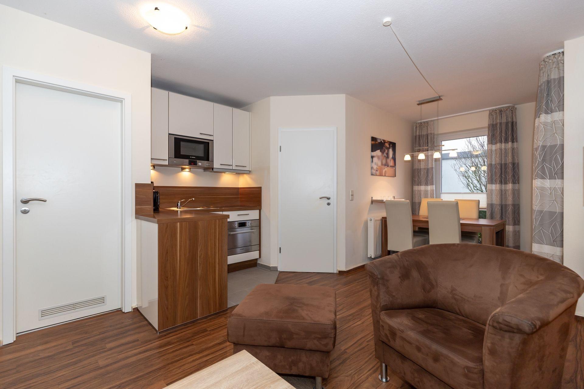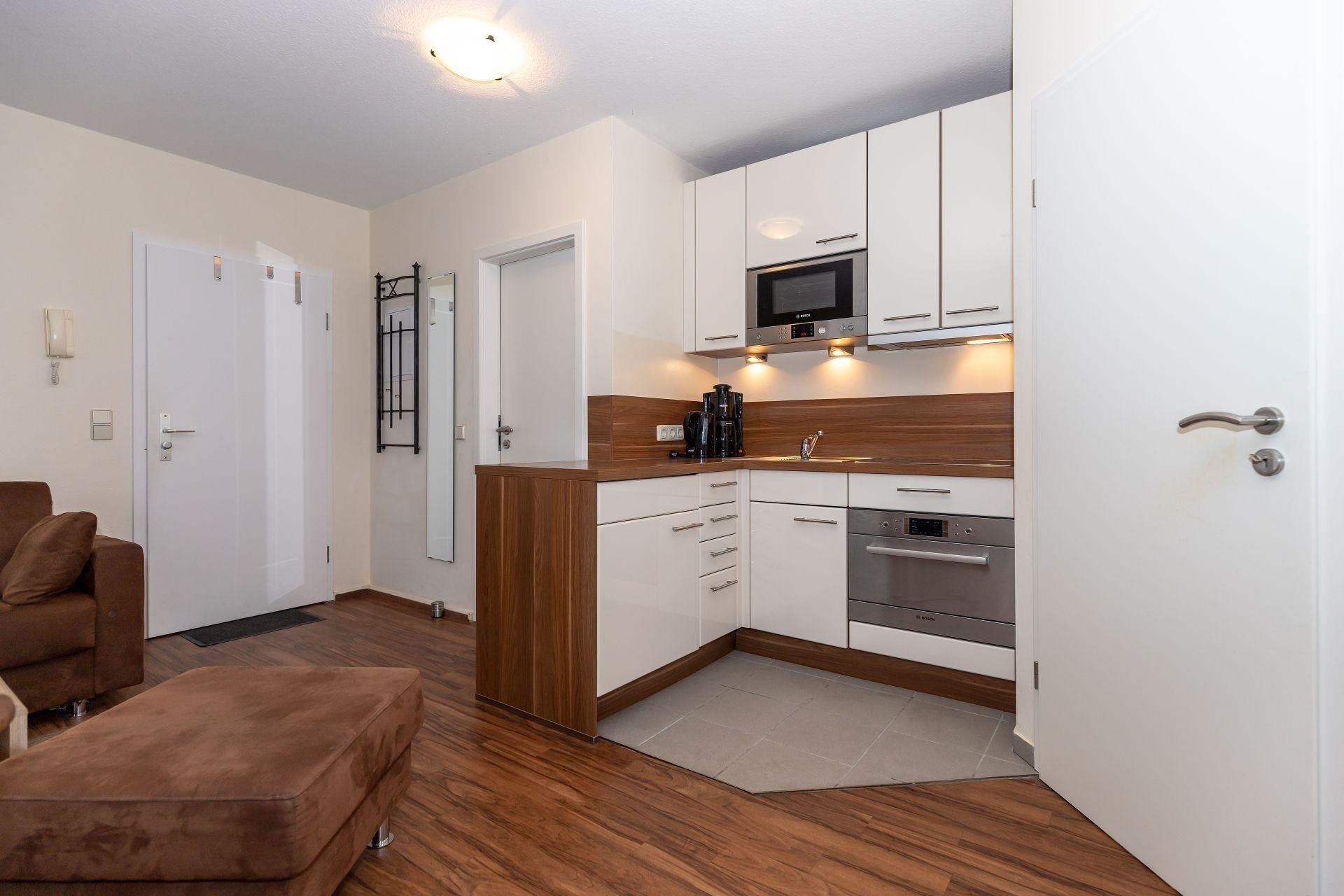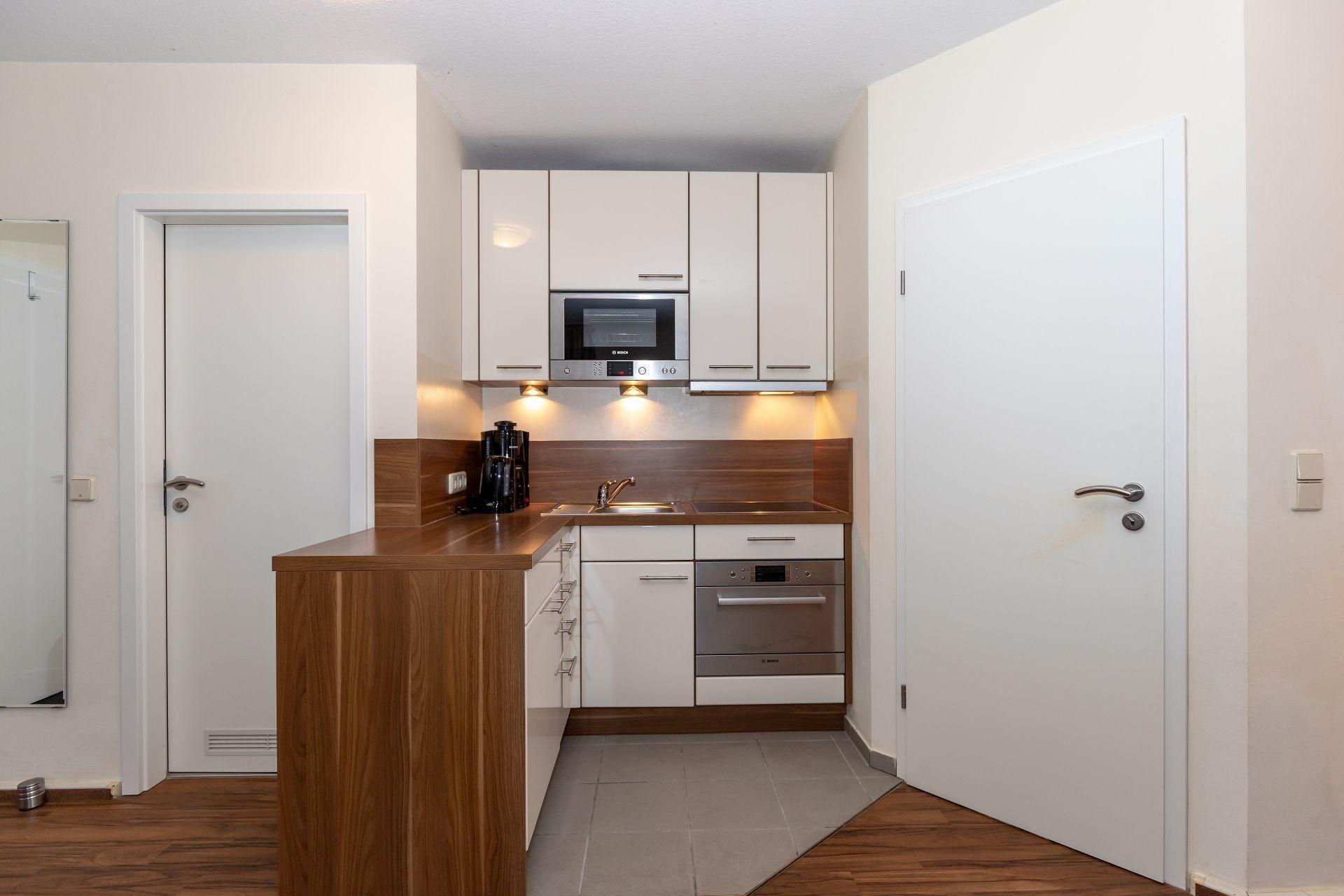 An den Wohnbereich grenzt die Küchenzeile, die voll ausgestattet ist. Hier finden Sie alle Bequemlichkeiten einer modernen Küche. Schnell sind Ihre Mahlzeiten zubereitet, die Sie gemeinsam am großen Esstisch einnehmen können.