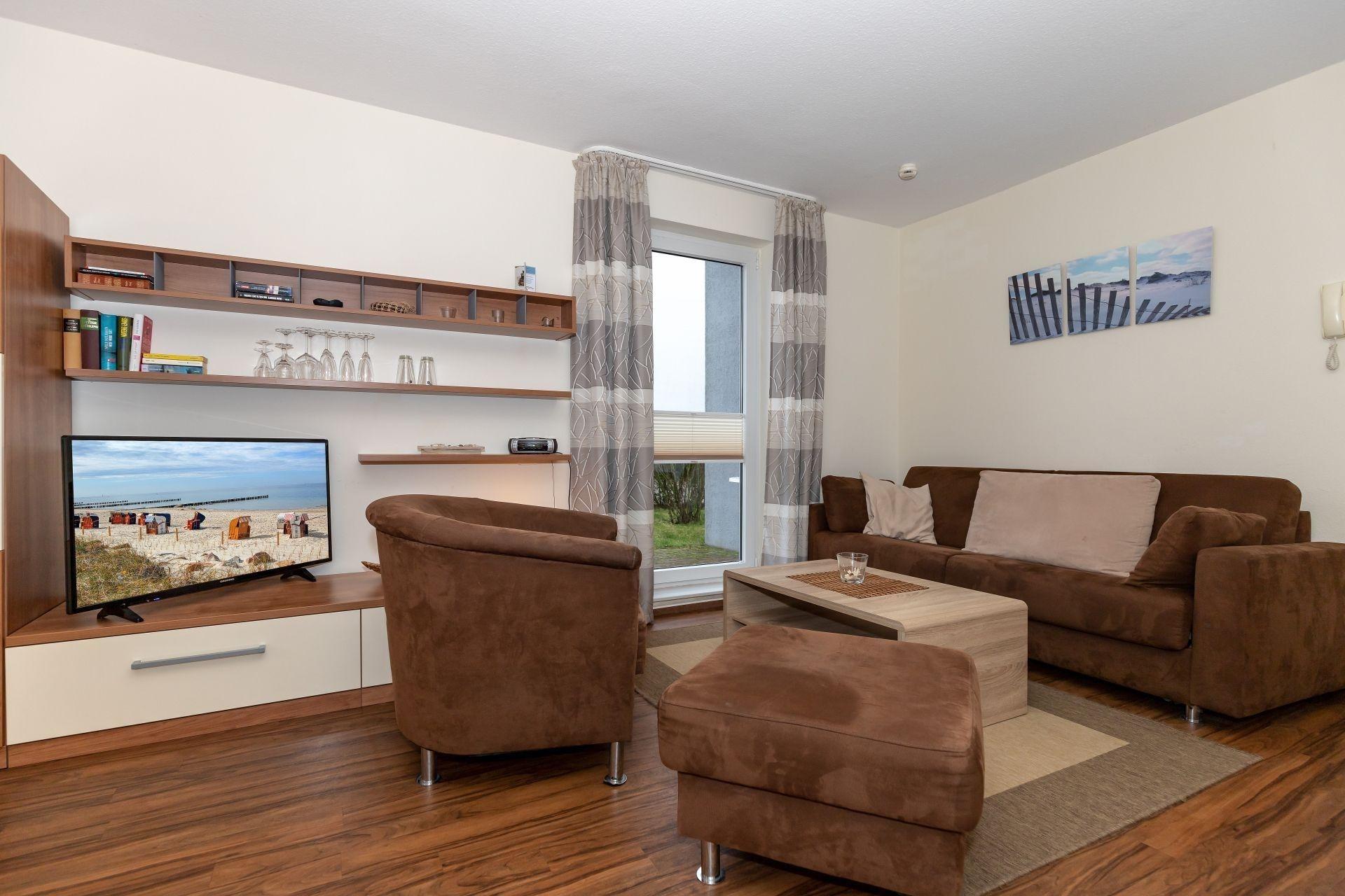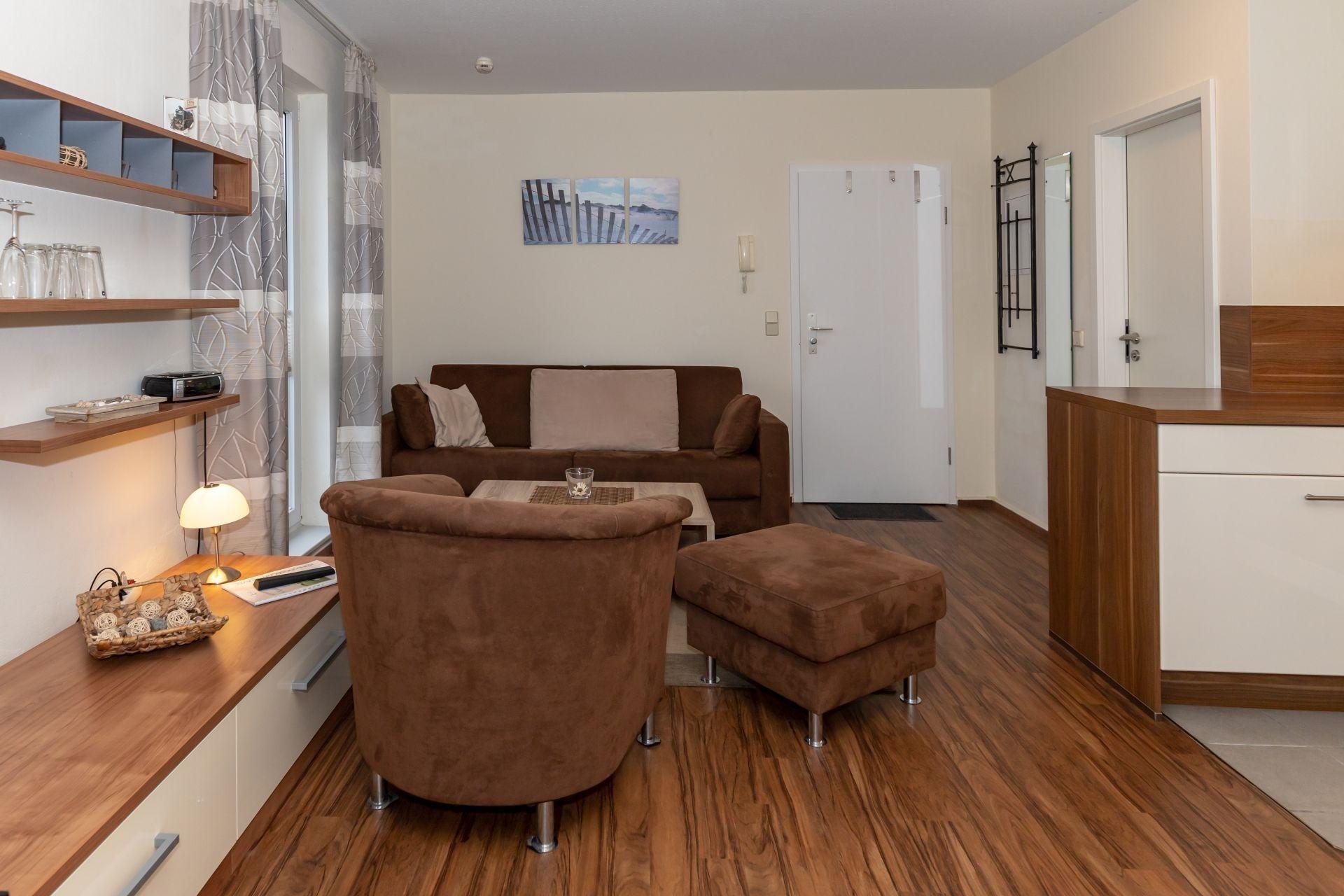 An Ihre Wohnung grenzt eine windgeschützte Terrasse zur Südseite, die Sie direkt von Ihrem Wohnzimmer aus betreten können. Die bequemen Möbel laden zum Sonnenbaden ein, und am Abend können Sie in diesem gemütlichen Ambiente einen ereignisreichen Tag bei einem leckeren Getränk langsam ausklingen lassen. So sind Sie gewappnet für einen weiteren erlebnisreichen Tag.