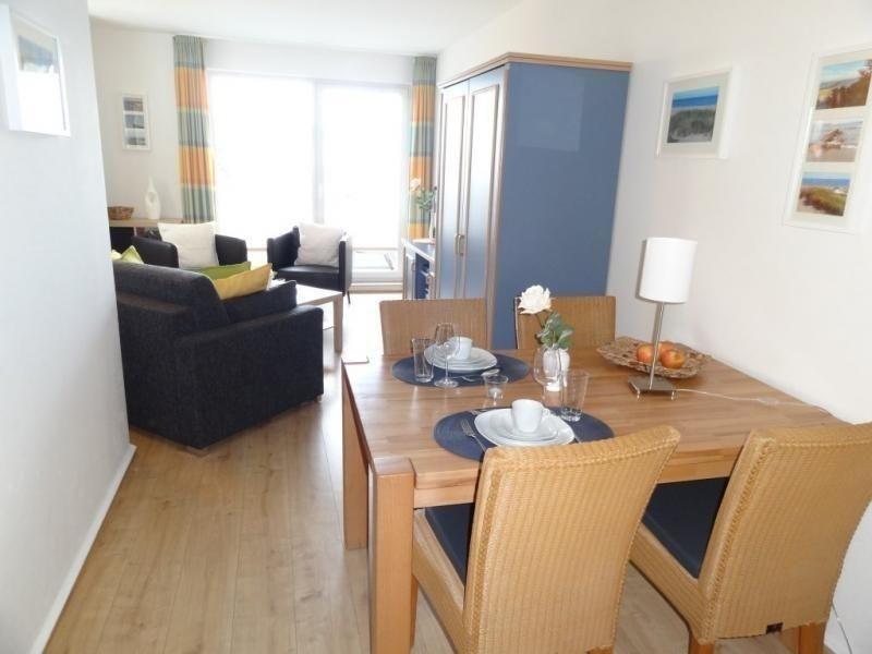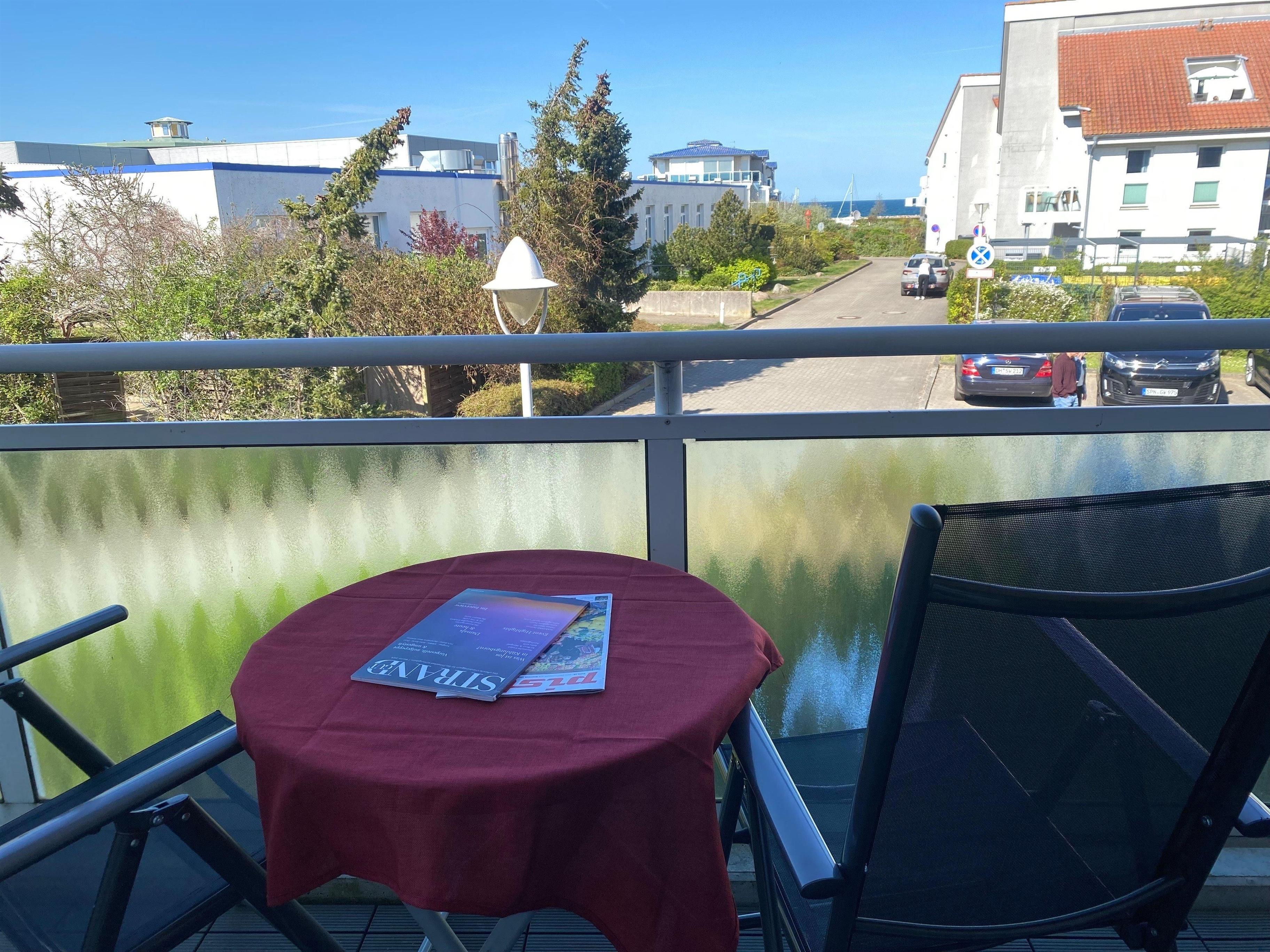 An Ihre Wohnung grenzt ein windgeschützter Balkon zur Nordseite, der mit einem Tisch, einer Gartenbank, 2 Stühlen, Auflagen und einem Wäscheständer ausgestattet ist und den Sie vom Wohnzimmer aus betreten können.