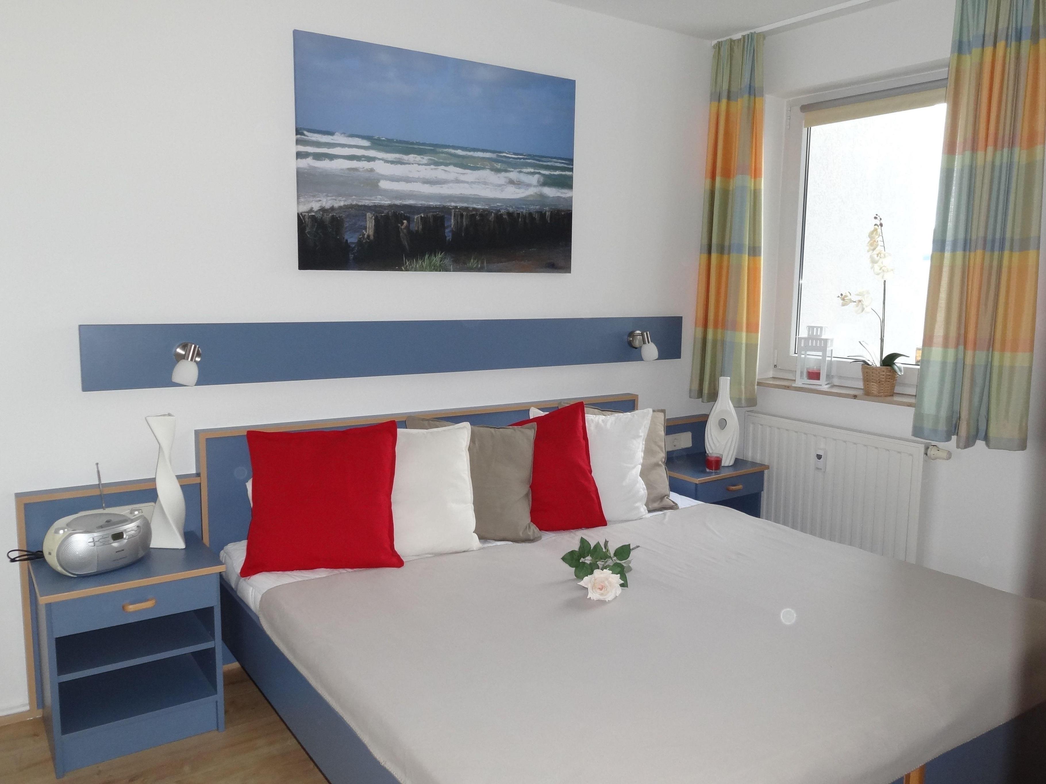 Das separate Schlafzimmer ist mit einem bequemen Doppelbett eingerichtet. Ausstattung und Farbgebung sorgen für einen geruhsamen Schlaf.