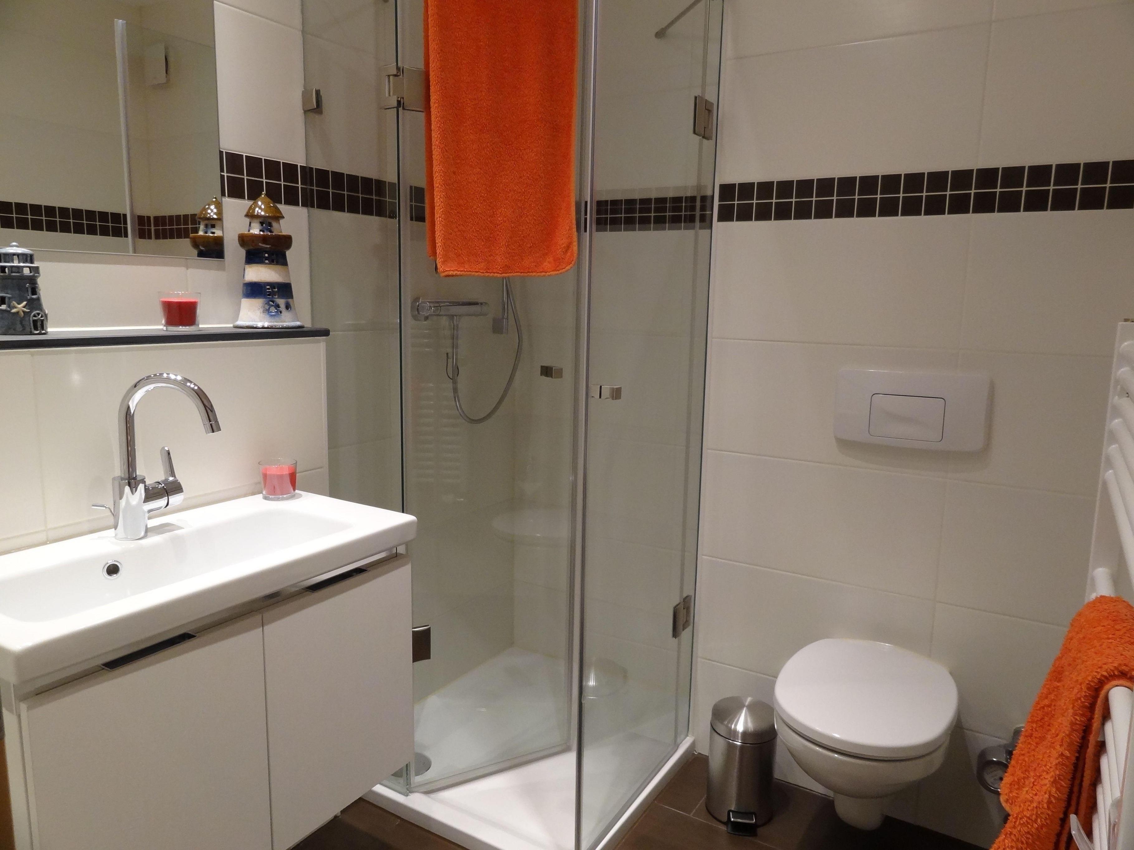 Das Badezimmer ist modern eingerichtet mit WC, einem Handtuch-Heizkörper, einem Waschtisch mit Unterschrank und einer Echtglas-Dusche, die einen niedrigen Einstieg besitzt sowie genügend Ablagemöglichkeiten für Ihre Badutensilien.